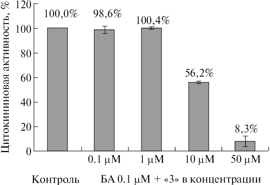Цитокининовую активность соединения 3 определяли в физиологической концентрации 10–6 М по уровню GUS-активности, отражающей интенсивность экспрессии конструкции Parr5: GUS [13], и рассчитывали в процентах от активности природного цитокинина БА в той же концентрации. Из всех полученных значений предварительно вычитали уровень GUS-активности, индуцированной эндогенными цитокининами. В результате было показано, что данное соединение не проявляет выраженной фитогормональной активности ни для одного из рецепторов цитокининов арабидопсиса.
