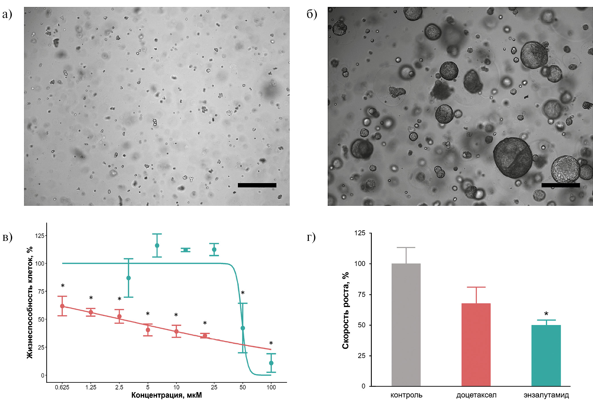 Прижизненные микрофотографии культуры органоидов рака предстательной железы в проходящем свете, 2-й пассаж сразу после пересадки (а) и через 14 дней после пересадки, отрезок масштаба 400 мкм (б), жизнеспособность органоидов после обработки доцетакселом (красный) и энзалутамидом (голубой) в диапазоне концентраций от 0.625 до 100 мкМ (в) и скорость роста органоидов после обработки доцетакселом и энзалутамидом в клинической концентрации (г), * означает статистическое различие с контролем (p < 0.05).