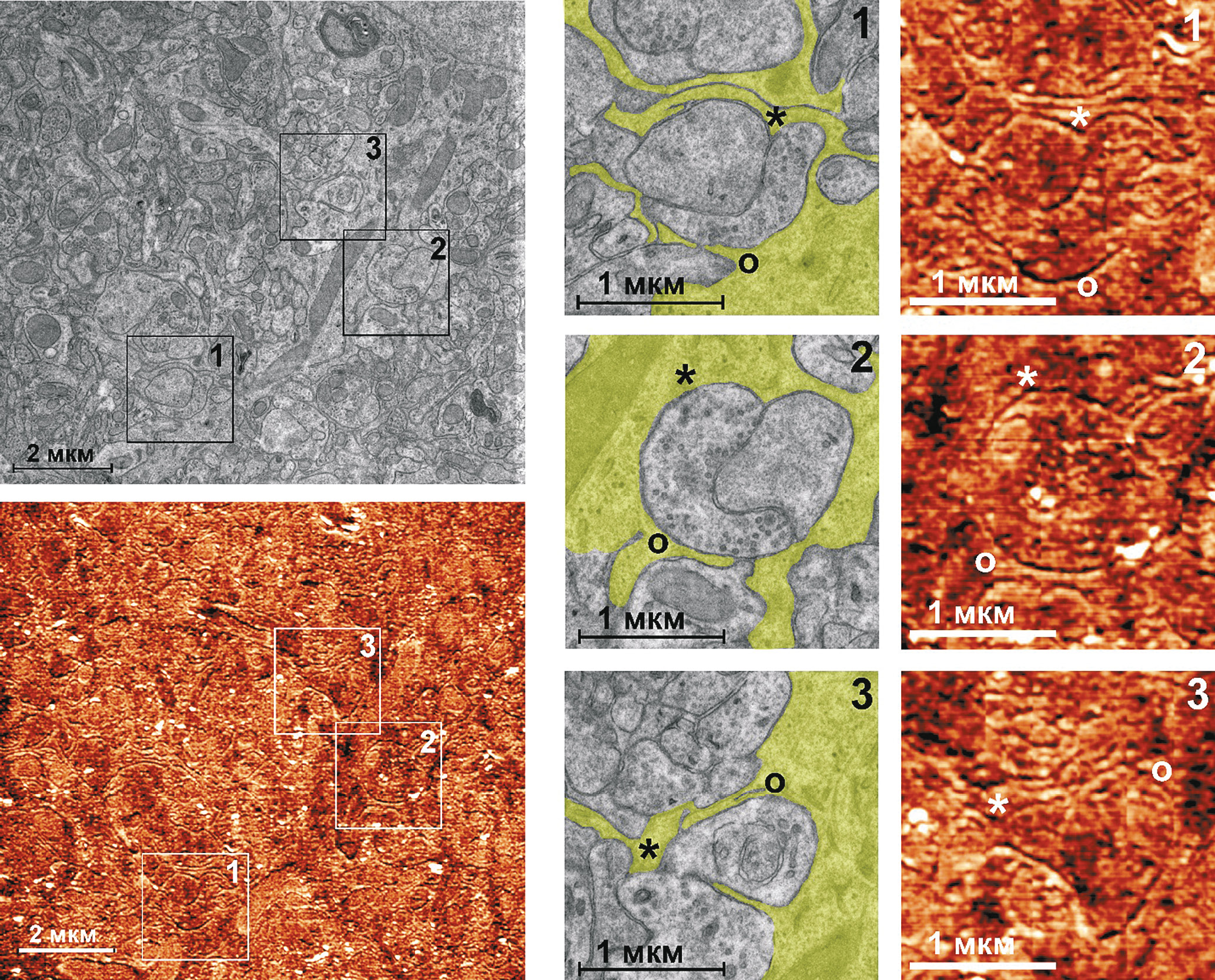 Комплементарные ПЭМ- и СЗМ-изображений участков астроцитов. Обзорные изображения (слева) и увеличенные участки (справа). На увеличенных изображениях тонкие отростки астроцитов на ПЭМ-изображениях отмечены цветом, символами указаны комплементарные области.