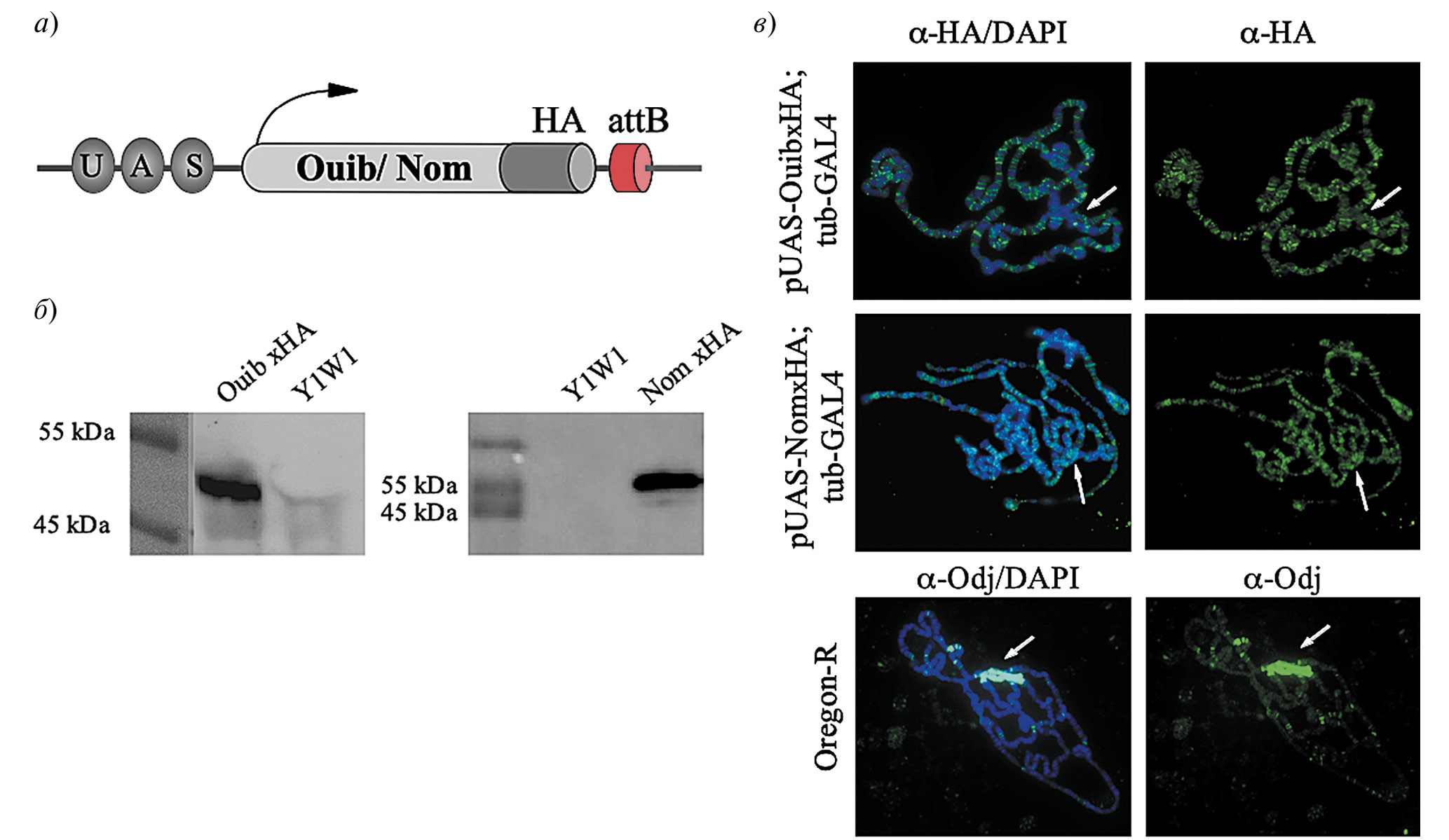 Рис. 2. Схема генетической конструкции, используемой для создания трансгенных мух, экспрессирующих белок, слитый с HA-эпитопом (а); вестерн-блот анализ белковых экстрактов из 2–3-дневных самцов, экспрессирующих OuibxHA и NomxHA, окрашенные антителами к HA-эпитопу (б); политенные хромосомы слюнных желез личинок мух, экспрессирующих OuibxHA и NomxHA. Политенные хромосомы были окрашены антителами к эпитопу HA, ДНК окрашена DAPI. Для сравнения приведено иммуноокрашивание политенных хромосом из лиинии Oregon-R кроличьими антителами к гетерохроматиновому белку odj (в). Стрелками показано положение хромоцентра на разных препаратах политенных хромосом. Масштаб – 10 мкм.