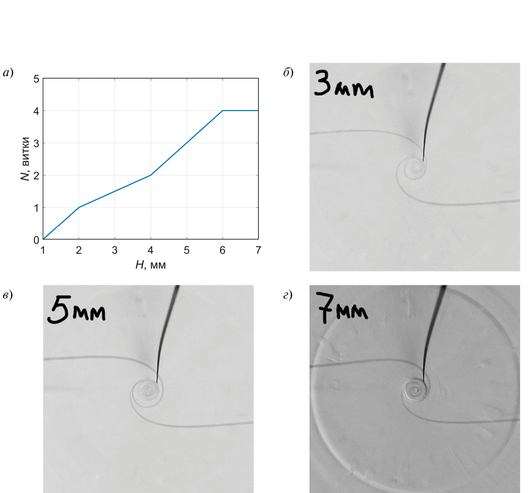 Рис. 5. Экспериментальная зависимость количества витков линии от высоты подъема измерительной иглы в щели канала (а) и фотографии линий тока при положении камеры над каналом (б-г): Контрольная игла расположена справа, измерительная игла – слева; струя красителя сверху визуализирует границу канала. Из рис. 5 видно, что количество витков спиральной линии тока нарастает при увеличении высоты подъема измерительной иглы. По рис. 5г видно, что визуальное отслеживание количества витков в крайнем положении измерительной иглы затруднено.