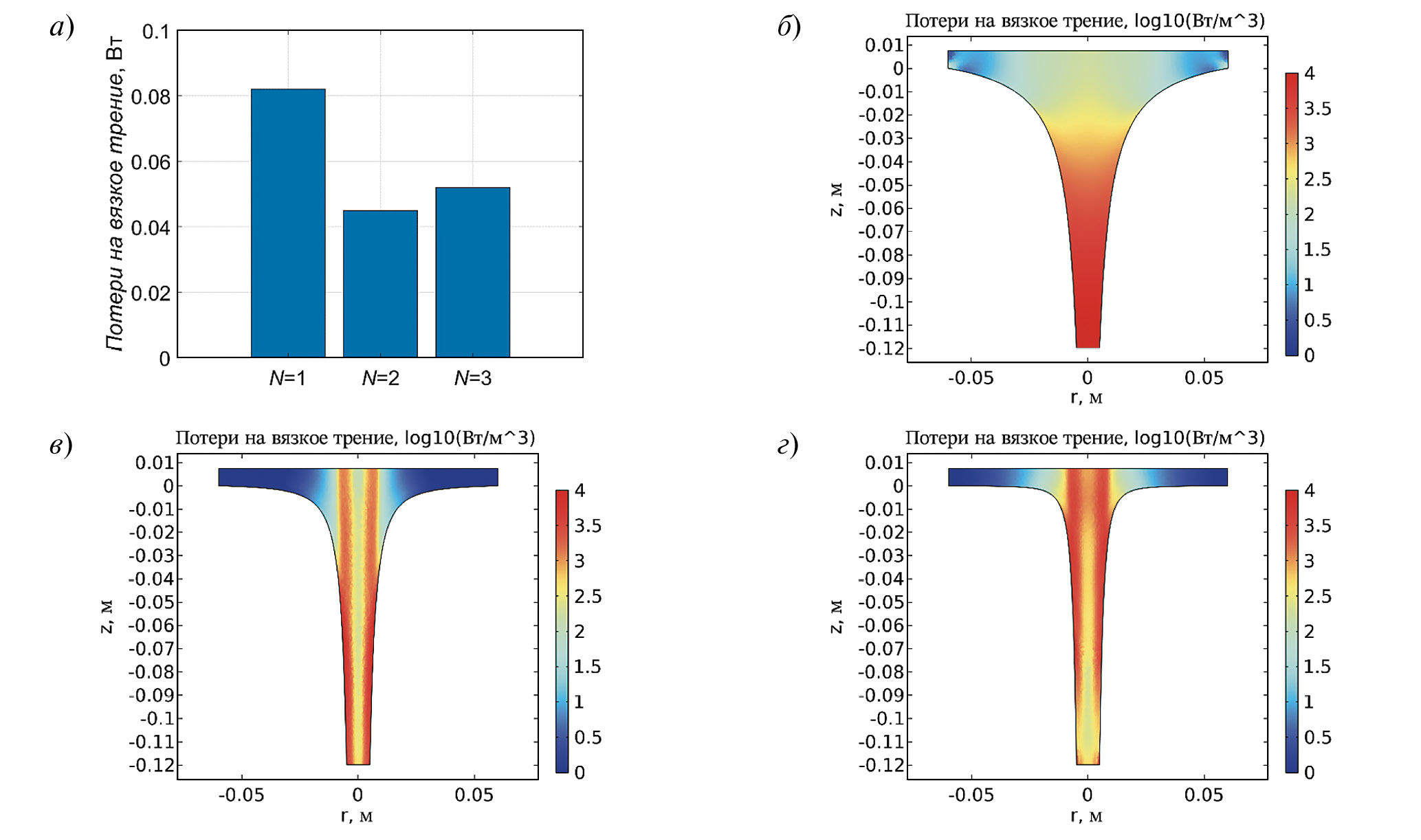 Рис. 9. Интегральные потери на вязкое трение для каналов zRN = const разного порядка степени (а), распределение потерь на вязкое трение в каналах при N = 1; 2 и 3 (б, в, г) Видно, что в канале с показателем степени N = 1 вихревая структура не формируется. В каналах с показателем степени N = 2, 3 течение носит вихревой характер, при этом в канале N = 2 значения потерь в области формирования вихря ниже, чем в случае N = 3.