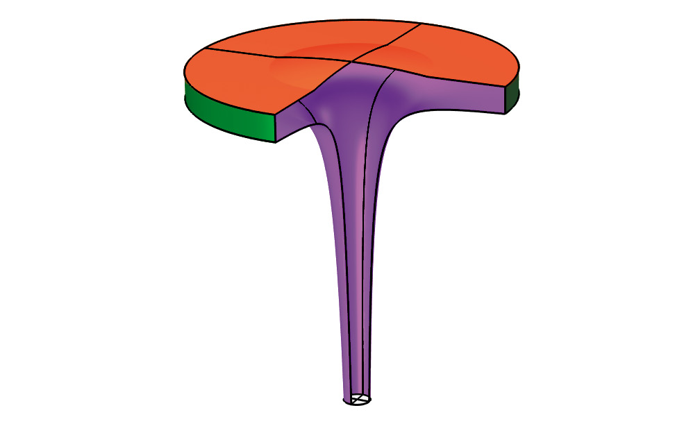 Рис. 11. Пример геометрической конфигурация канала с показателем степени N = 2 с вогнутой поверхностью при параметрах габаритной высоты поверхности h = 5мм и отношении габаритного радиального размера вогнутой поверхности к входному радиусу канала k = 0,5.