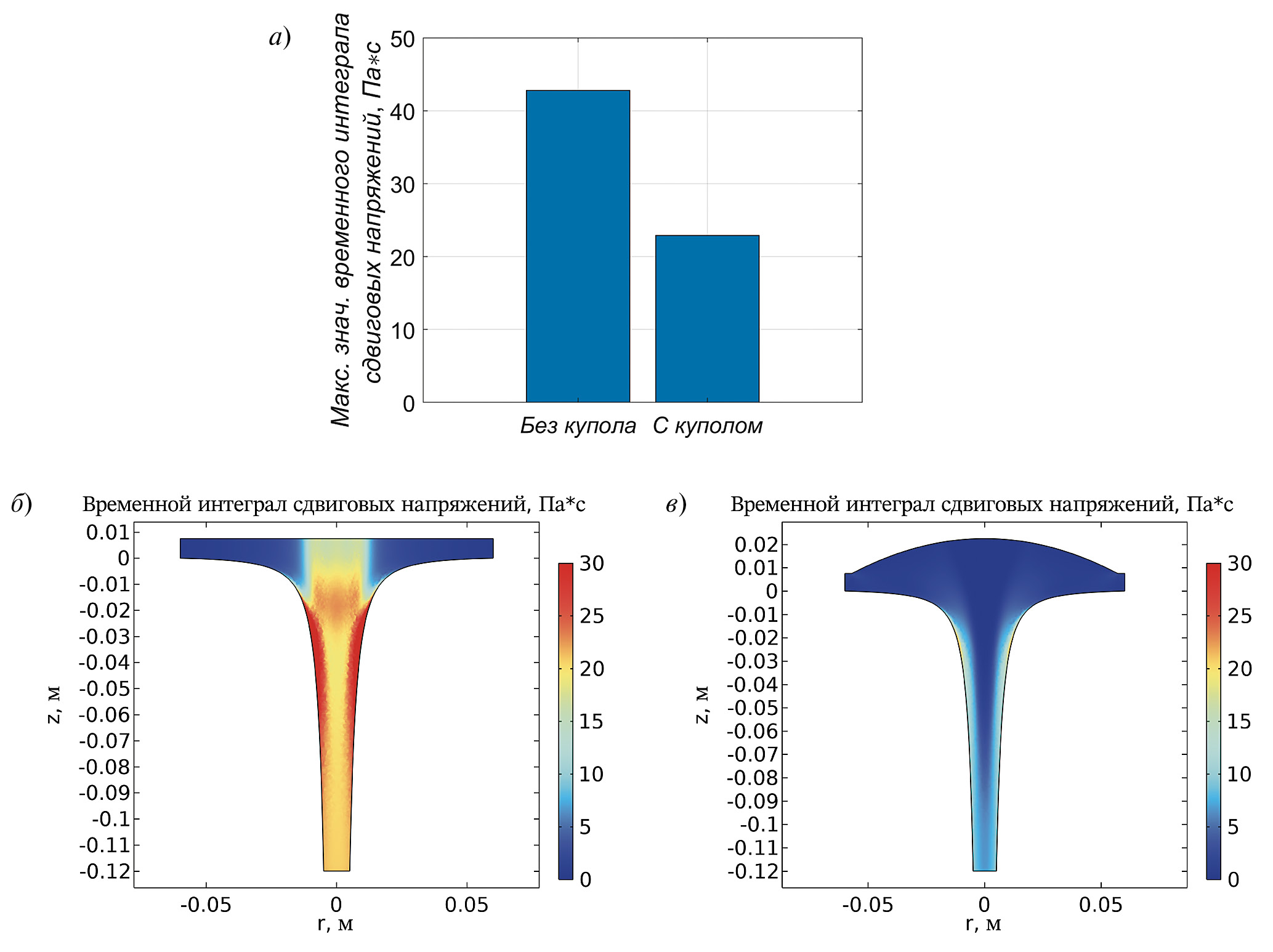 Рис. 17. Максимальные значения временных интегралов сдвиговых напряжений в каналах при наличии и при отсутствии вогнутой поверхности (а), структура интеграла действия сдвиговых напряжений в этих каналах (б, в). Видно, что наличие вогнутой поверхности позволяет снизить воздействие сдвиговых напряжений в два раза в пристеночной зоне, а также кратно снижает их действие в области формирования вихревого движения.