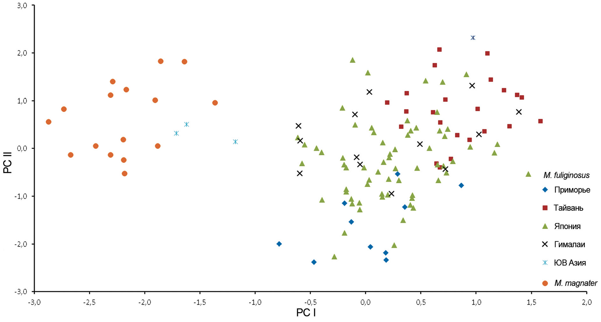 Для оценки характера изменения количественных признаков был проведен анализ главных компонент (PC) и дискриминантной функции (DF) с использованием соответствующих модулей STATISTICA для Windows версии 7.0. Обучающий набор для расчета квадратов дистанций Махаланобиса и апостериорных вероятностей в рамках DF-анализа включал пять географических выборок M. fuliginosus “Приморье”, “Афганистан”, “Тайвань”, “Кюсю”, “Хонсю”) и выборку материковых M. magnater. Часть экземпляров, в том числе обсуждаемые экземпляры из провинции Каобанг, были включены в анализ как “неопределенные”.