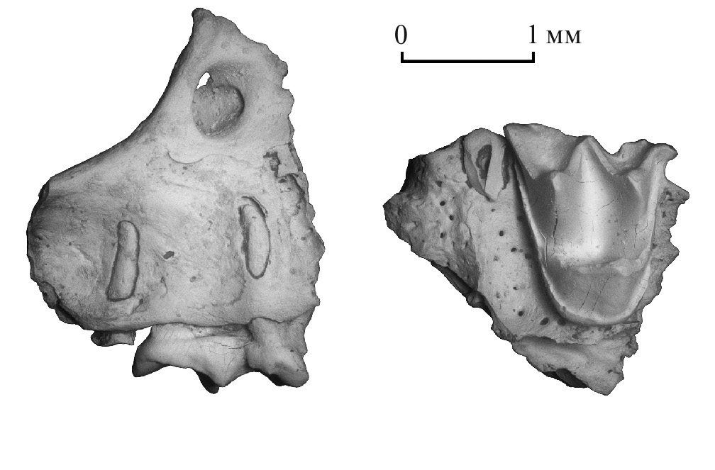 Размеры в мм. Экз. ПИН, № 5644/651: M1: лабиальная длина – 1.4, лингвальная длина – 0.9, ширина – 1.6, ширина паракона – 0.75, ширина метакона – 0.95; ширина предглазничного мостика – 0.22.