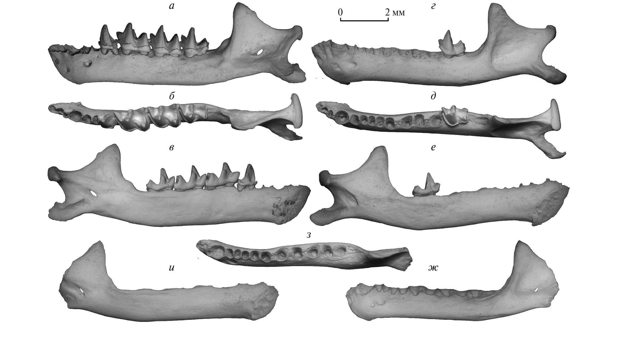 Рис. 2. Plecotus macrobullaris sarmaticus, Lopatin, subsp. nov. (СЭМ): а–в – голотип ПИН, № 5644/652, левая нижнечелюстная кость с P4–M3 : а – с лабиальной стороны, б – с окклюзиальной стороны, в – с лингвальной стороны; г–е – экз. ПИН, № 5644/653, левая нижнечелюстная кость с M3: г – с лабиальной стороны, д – с окклюзиальной стороны, е – с лингвальной стороны; ж–и – экз. ПИН, № 5644/654, левая нижнечелюстная кость без зубов: ж – с лабиальной стороны, з – с окклюзиальной стороны, и – с лингвальной стороны; Россия, Крым, пещера Таврида; нижний плейстоцен.