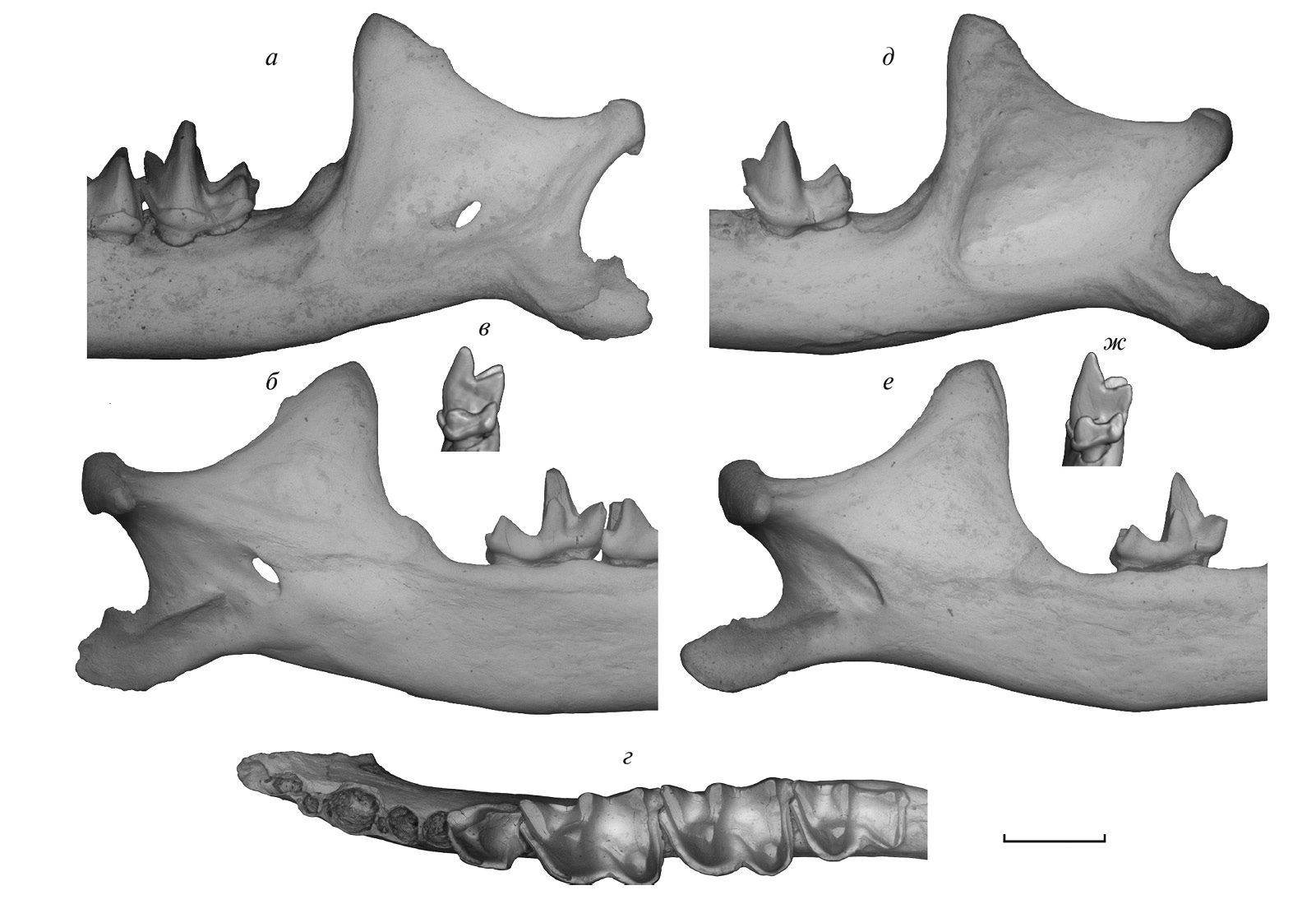 На лабиальном цингулиде в основании гипофлексида каждого нижнего моляра (M1–M3 на голотипе; M3 на экз. ПИН, № 5644/653) располагается отчетливая фасетка стирания от окклюзии с параконом соответствующего верхнего моляра (рис. 2а, 2г, 3а, 3д).
