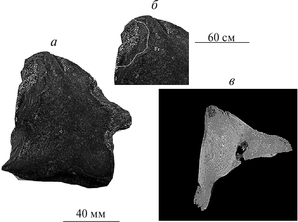 Экз. ПИН, №5462/33 (рис. 4а) представлен лобной костью с хорошо сформированным надглазничным отростком. На боковой поверхности, которая формирует боковую стенку черепной коробки, различимы борозды шовной поверхности лобно-теменного шва, а также небольшой сохранившийся фрагмент теменной кости (рис. 4б). На переднем крае надглазничного отростка, ближе к лобно-челюстному шву, прослеживается небольшая предглазничная вырезка. На передней поверхности кости, под отростком лобно-челюстного шва, хорошо различимо отверстие обонятельного нерва (рис. 4в), а в полости остатки решетчатой кости. Очевидно, как и у взрослых животных, лобные кости формируют лобный шов, но исключены из формирования вершины черепа. По пропорциям этот экземпляр ближе всего к возрастной группе экз. ПИН, №5462/84 и экз. ПИН, №5462/35.