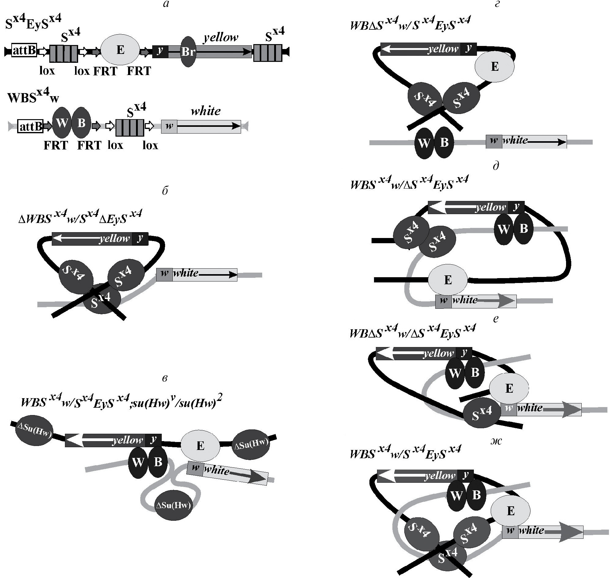 При вырезании сайта S×4, расположенного между энхансерами тела и крыльев и промотором гена white, фенотип мух из транс-гетерозиготной линии y1w1118;WBΔS×4w/ S×4EyS×4 был таким же, как при вырезании всех энхансеров: желтые глаза, светлые тело и крылья (табл. 1). Мы предполагаем, что взаимодействие между двумя инсуляторами в конструкции S×4EyS×4 приводит к формированию петли, которая препятствует сближению гомологичных районов хромосом и полностью изолирует заключенные в ней ген yellow и энхансер глаз (рис. 3г).