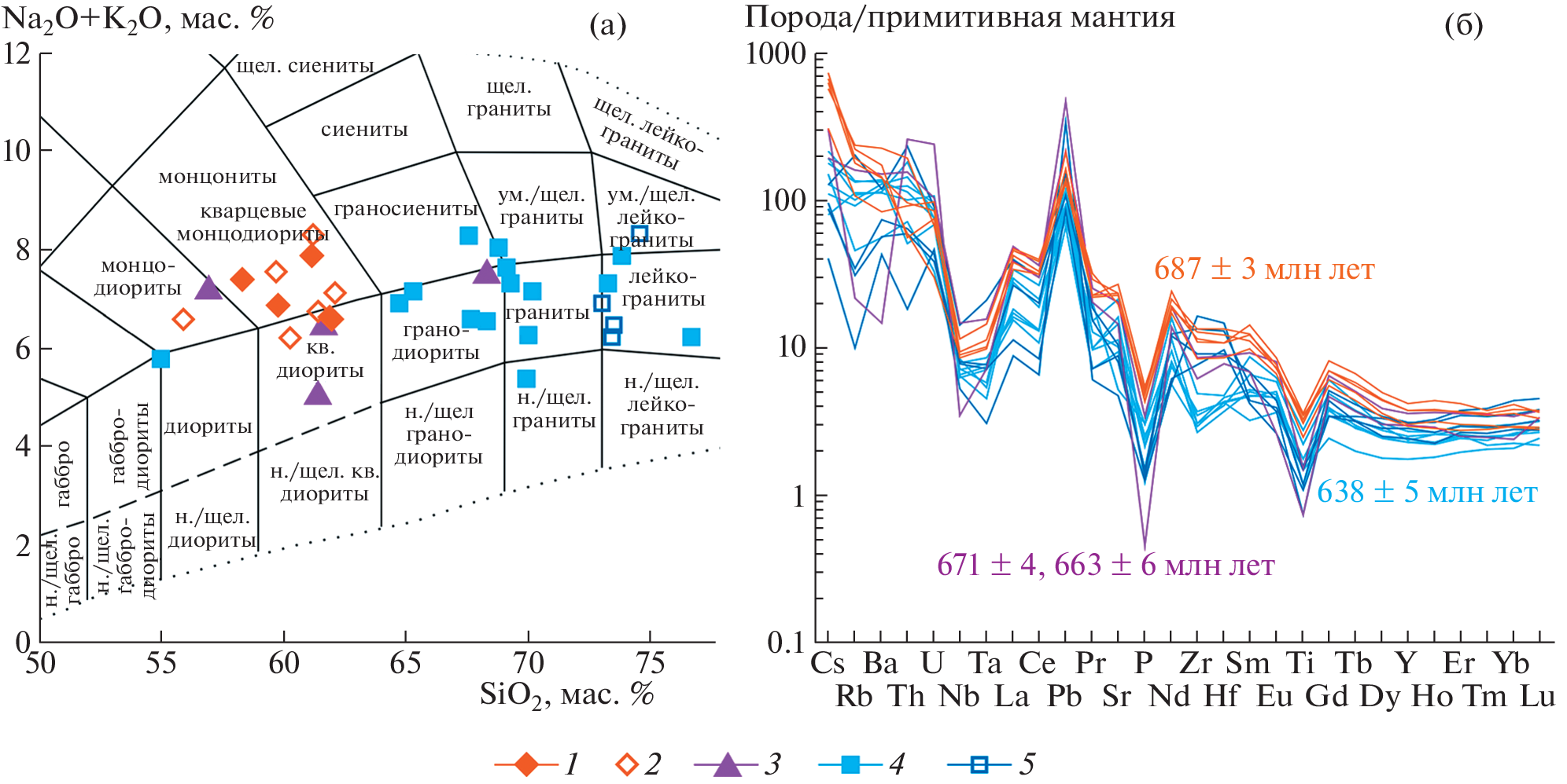 На Полярном Урале известны немногочисленные и небольшие по размерам гранитоидные тела (яркеуский, яйюский и погурейский комплексы), которые принято относить к этапу уральской коллизии. Их каменноугольно-раннепермский возраст, в большинстве случаев, основан на методически устаревших K/Ar-датировках, а также предполагается по полевым геологическим взаимоотношениям. Нами исследованы монцонитоиды Яркеуского петротипического массива – одного из наиболее крупных таких интрузивов, и для него впервые получены позднедокембрийские U–Pb LA-ICP-MS (по циркону) и 40Ar/39Ar (по амфиболу) возрасты – 687 ± 3 и 669 ± 8 млн лет, соответственно. Водонасыщенный флюидный режим (наличие магматического амфибола и высокое содержание в нем воды – 4.5–5.6 мас. %,), гипабиссальные условия формирования (P = 2.1–3.5 кбар, T = 871–960°C), особенности химического состава монцонитоидов (низкие содержания TiO2 (0.6–0.8 мас. %), CaO (3.6–6.3 мас. %), высокие – Al2O3 (16.6–18.0 мас. %) и K2O (1.7–4.6 мас. %), обогащение крупноионными литофильными элементами относительно высокозарядных и редкоземельных элементов, Ta–Nb-минимум и Pb-максимум), а также металлогеническая специализация на Cu и Mo (±Pb, Hg, Au), свидетельствуют о формировании пород яркеуского комплекса в надсубдукционной обстановке в достаточно мощной континентальной коре. Изотопные часы в этих монцонитоидах запечатлили два этапа сборки суперконтинента Пангея: самый ранний этап – позднедокембрийский, когда на Большеземельской активной окраине Арктиды формировались монцонитоиды, и один из поздних – средне-позднекаменноугольный этап, на котором породы претерпели метаморфизм вследствие закрытия Палеоуральского океана и начала коллизии между Аркт-Лавруссией и Сибирью.