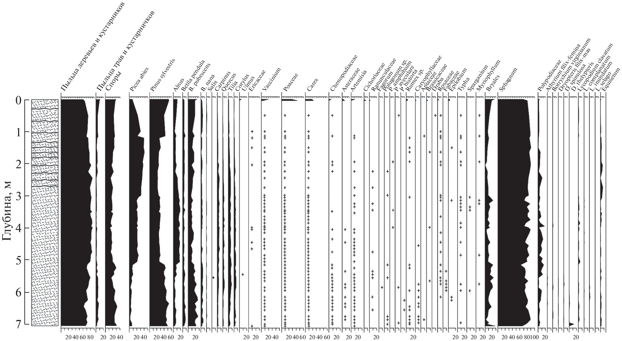 По материалам георадиолокационного зондирования, спорово-пыльцевого анализа и радиоуглеродного датирования торфяного разреза (7 м) модельного верхового болота национального парка Валдайский (Новгородская область) проведена палеоклиматическая реконструкция последних 14 тыс. лет. Скорости торфонакопления колебались от 0.075 мм/год в позднеледниковье до 1.15 мм/год в бореале (в период падения уровня Валдайских озер на 10 м) и 4.25 мм/год в последние столетия. Многочисленные циклы голоценовых потеплений/похолоданий были в пределах ± 1–2°С к современным и сопровождались умеренными колебаниями годовых осадков (±25–50 мм). Наиболее крупные перестройки лесного покрова происходили при потеплении в атлантическом периоде, когда в регионе господствовали елово-широколиственные леса и дубравы. Последние два тысячелетия на динамику растительности региона влияла преимущественно аграрная деятельность.