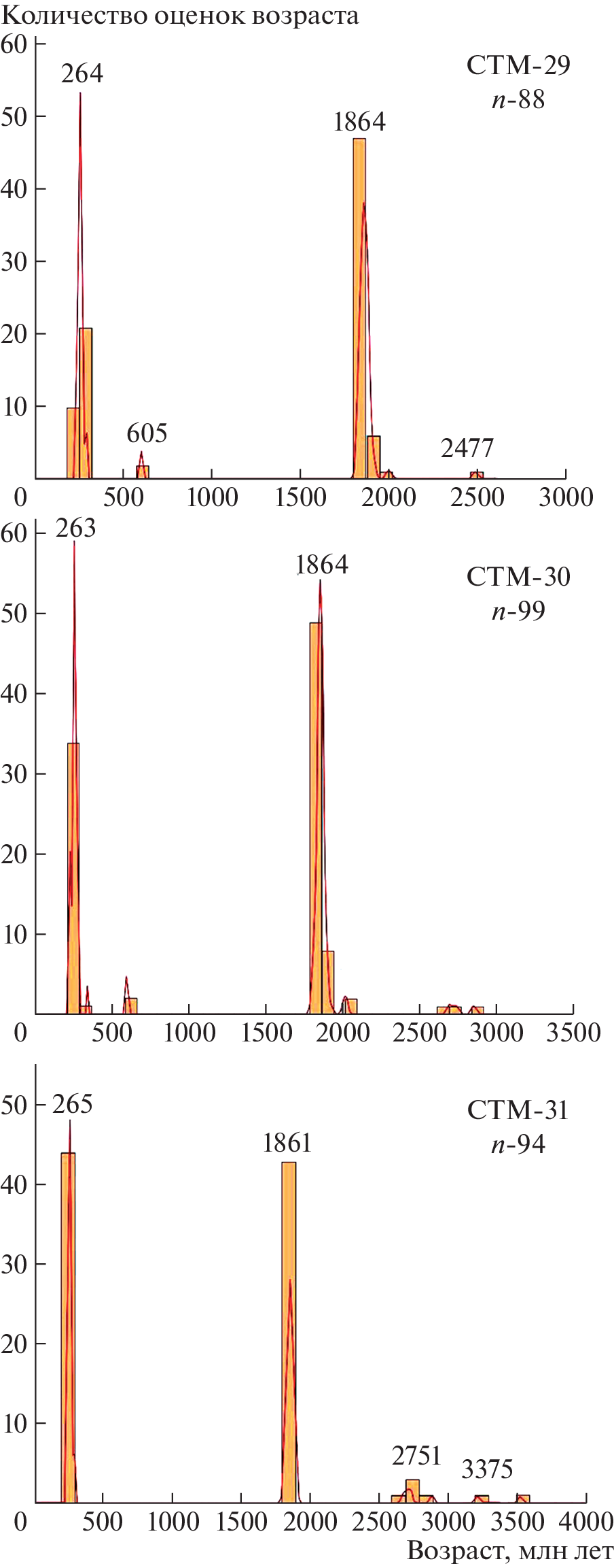 The results of U–Th–Pb (LA-ICP-MS) geochronological studies of detrital zircon (fraction more than 50 µm) from the Late Cenozoic deposits of the large aeolian “Sands” massif of the Chara Basin of the eastern flank of the Baikal Rift Zone show that they are dominated by detrital zircon with ages of 263–265 and 1861–1864 Ma. Archean ages have been obtained only for individual zircon grains. Quite possibly, this is due to the fact that zircon of this age is present in “small” fractions, the study of which is not possible due to the technological features of the method of geochronological studies used. Based on the geological situation, only granites of the Kodar complex can be considered as the only source of detrital zircon of the Early Proterozoic age. The source of detrital zircon with an age of 263–265 Ma remains a mystery. Granitoids of this age are not known on the territory of the Aldan Shield. They are widespread in its western frame.