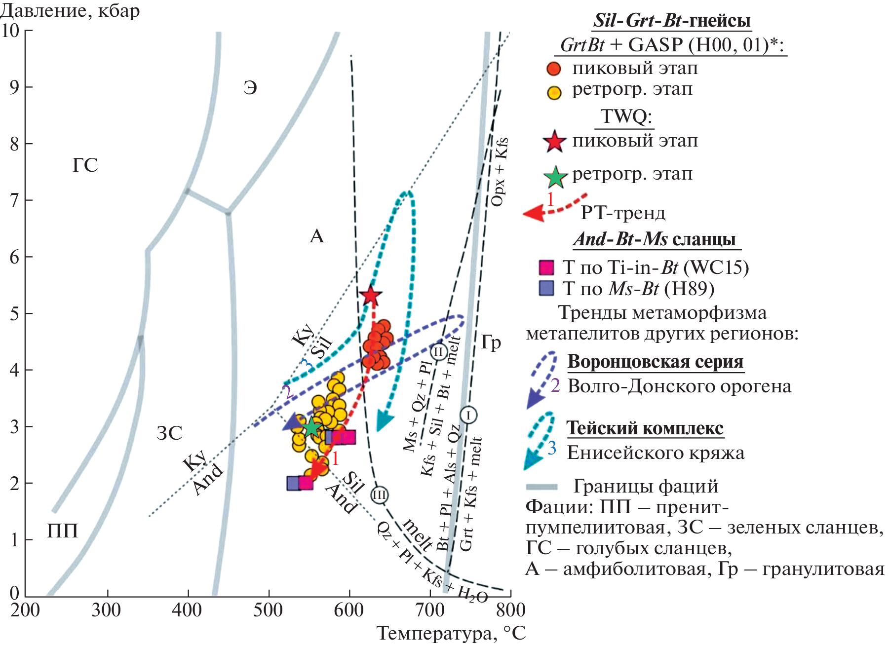 In the central part of the Vyatka belt, sandwiched between the Archean blocks in the northeast of the Volga-Ural segment of the East European craton, according to the core data from two deep wells, the following mineral parageneses were established in the metapelites of the Uni suite: (1) Pl + Ms + Bt + Qz + Kfs + And ± Chl and (2) Pl + Bt + Qz + Kfs + Grt + Sil ± Ms ± Chl (without staurolite and cordierite), corresponding to moderate pressure metamorphism of the amphibolite facies. To determine the P-T conditions for these parageneses a set of methods was used, including classical (Grt-Bt, GASP, Ti-in-Bt, Ms-Bt) and multi-equilibrium thermobarometry (winTWQ 2.34), as well as the isopleth intersection method on pseudosection diagrams (GeoPS 3.2.2.128). The calculated P-T values of metamorphism are 520–650°C (or up to 690°C according to the isopleth method) and 2–5.4 kbar. Paragenesis (2) rock was accompanied by anatexis in the water-saturated system. Zoning can be distinguished in the metamorphism of the rocks, it belongs to a relatively shallow type, to the andalusite-sillimanite subfacies.