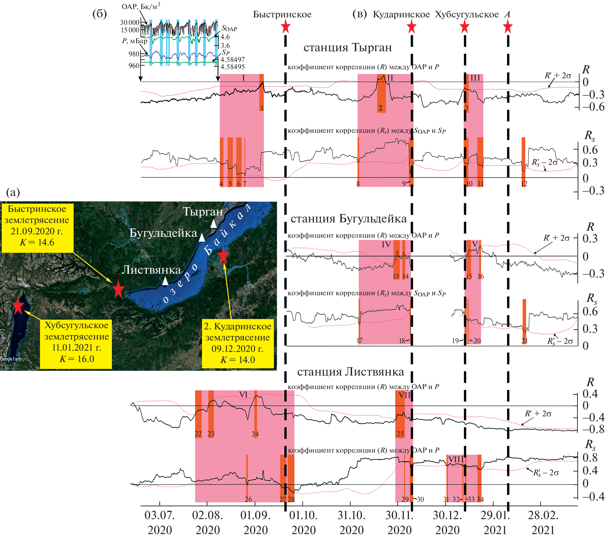 A comparison was made of temporal variations in atmospheric pressure and soil radon concentration measured in loose sediments at three monitoring stations in the Baikal region for the period of manifestation of three fairly strong earthquakes – Bystrinsky (21.09.2020, K = 14.6), Kudarinsky (09.12.2020, K = 14.0) and Khubsugulsky (11.01.2021, K = 16.0). It has been established that the release of radon is controlled in the region by variations of atmospheric pressure. Irregularities of this dependence, first identified in the course of a formalized statistical analysis, occur for each of the studied seismic activations. They are connected with the process of preparing an earthquake, which opens up real opportunities for developing an emanation approach to medium-term forecasting.