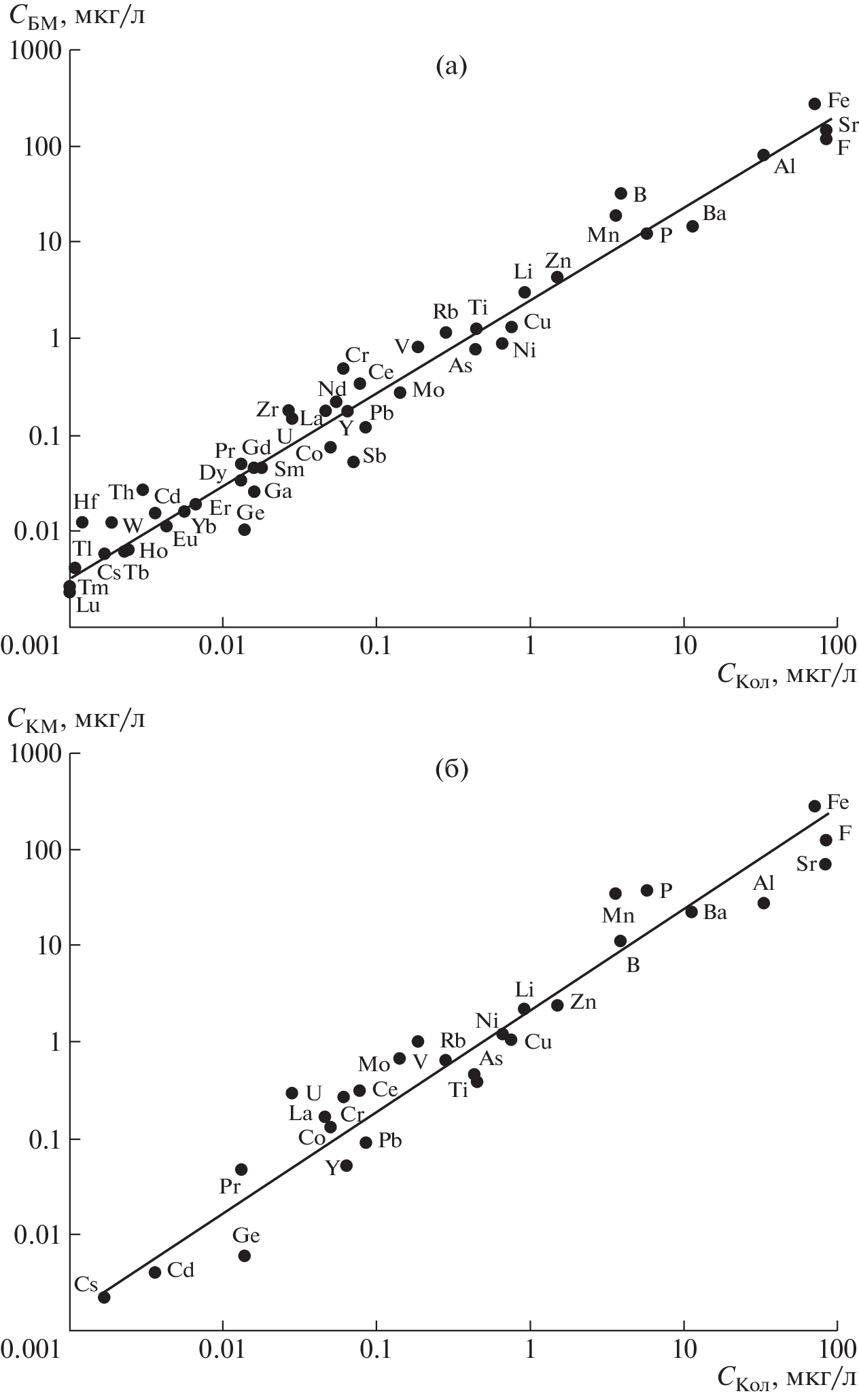 The content of ions of the main salt composition and 50 dissolved trace elements (Li, Rb, Cs, Be, Sr, Ba, Mn, Fe, Co, Ni, Cu, Zn, Cd, Tl, Pb, Al, Sc, Ga, Y, La, Ce, Pr, Nd, Sm, Eu, Gd, Tb, Dy, Ho, Er, Tm, Yb, Lu, Ti, Zr, Hf, Th, U, F, B, Si, Ge, P, V, As, Sb, Cr, Se, Mo, W) in the waters of the Kolyma River mouth section the spring–summer flood decline and on the summer–autumn period was determined. A close positive correlation was established between the dissolved trace elements concentrations in the waters of the Kolyma River and of the rivers in the White and Kara seas catchment areas. Differences in the concentrations of dissolved trace elements in the river waters of the Russian Arctic are generally proportional to the ratio of their mineralization values.