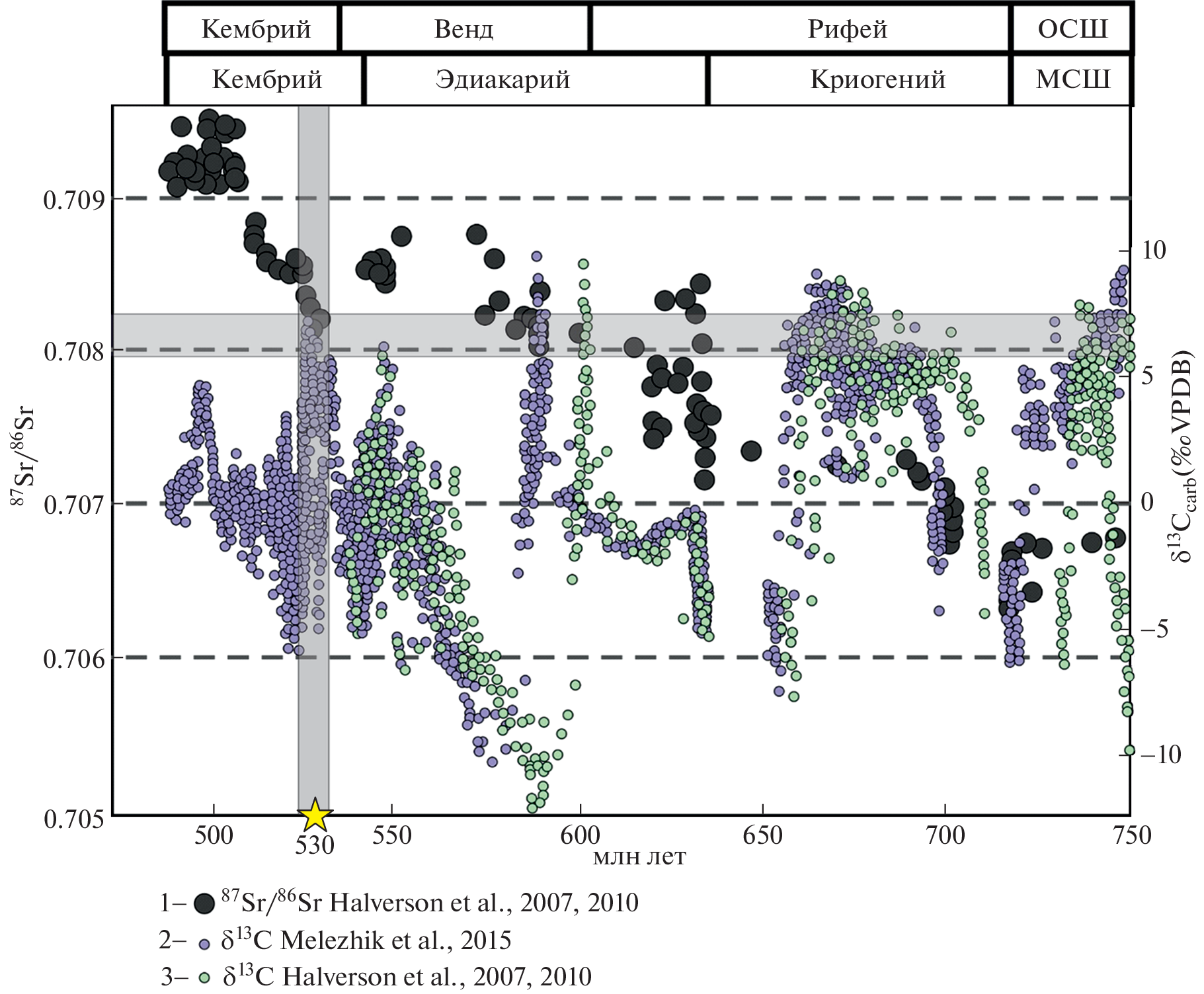 - Halverson G.P., Dudás F.Ö., Maloof A.C., Bowring S.A. Evolution of the 87Sr/86Sr composition of Neoproterozoic seawater // Paleogeogr. Paleoclimatol. Paleoecol. 2007. V. 256. № 3–4. P. 103–129.