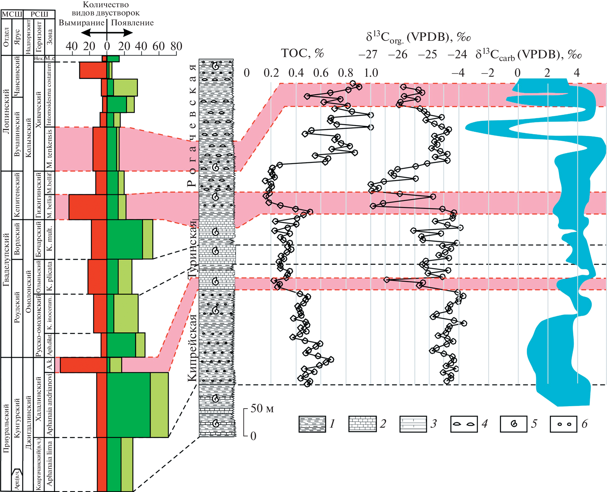 For the first time, a detailed record of the δ13Сorg value has been obtained in Permian mudstones of the Taskan Basin (Omulevka block, Northeast Asia), covering the interval from the Upper Kungurian, Roadian, Wordian, Capitanian, and Lower Wuchiapingian stages. The value of δ13 Corg. varies from –23.81‰ (middle Kungurian) to –26.97‰ (lower part of the Wuchiapingian). Three negative excursions of the δ13 Corg. value are clearly distinguished in the section – in the upper part of the Kungurian Stage of the Lower Permian, in the lower part of the Capitanian and at the boundary of the Capitanian – Wuchiapingian stages. These excursions are in good agreement with the episodes of mass extinctions established by us earlier (Biakov, 2012) and are most likely associated with periods of activity of island-arc magmatism in the region during the Permian.