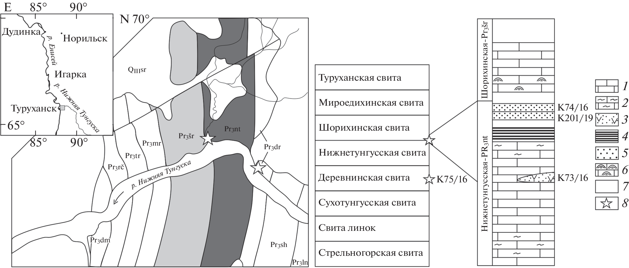 At the boundary of the Meso- and Neoproterozoic, Grenville collision events were widely manifested on the margins of ancient continental blocks. Most of the sedimentary sequences that had accumulated by that time had undergone significant thermal–metamorphic changes. In many ways, this is the main reason for the lack of isotopic data for carbonate deposits in the interval of 1200–900 Ma in world practice. Sr–isotopic composition in carbonate rocks with an age of 980–920 Ma was determined in the only section of the World – the Huainan Formation of the North China Platform with accumulation time determined by U–Pb dating of detrital zircon grains. In the upper part of the Nizhny Tunguska suite of the Turukhansk uplift, among carbonate deposits, we established the presence of altered volcanic rocks, as well as weathering crust products along them – poor bauxite and chamosite ores. Based on U–Pb zircon isotope dating, the age of the volcanic rocks is 964 Ma. For the least altered limestones of the upper part of the Nizhny Tungusska Formation, received 87Sr/86Sr values are 0.70532–0.70578, which are close enough to those found in the rocks of the Huainan Formation. Geochronological age of the studied limestones gives us more correct data. These data can be used to refine the previously proposed configuration of the Sr–isotopic composition variation curve in the Early Neoproterozoic. The Nizhny Tunguska Formation is the only carbonate section of the Early Neoproterozoic in the world with correctly geochronologically substantiated dating (based on zircon from subsynchronous volcanic rocks). This compares favorably with the Huainan formation.