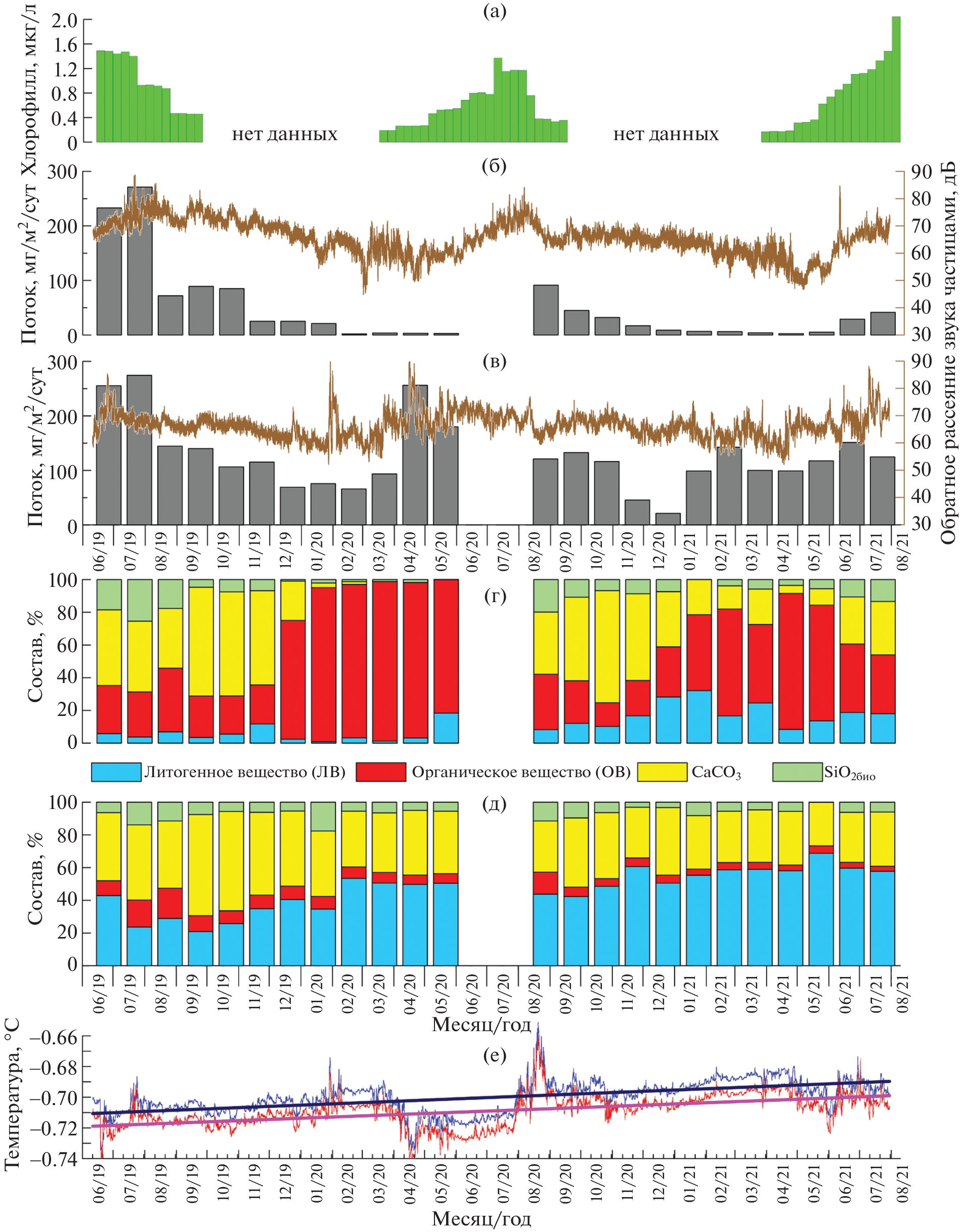 For the first time, a continuous two-year study of the particle fluxes and associated environmental parameters in the axial zone of the Arctic segment of the Mid-Atlantic Ridge at the junction of the Mohns and Knipovich Ridges (Norwegian Sea) was carried out. Sediment traps were deployed from the R/V Akademik Mstislav Keldysh in June 2019 in the northeastern part of the Mohns Ridge and realized in July 2020. It was shown that the sedimentation of sinking particles in the study area was influenced by the global transport of water masses in the northeastern direction, with Atlantic waters in the subsurface, and water masses of Arctic origin recirculating deeper in the subsurface. A weak positive temperature trend at a depth of more than 2500 m (0.02°C) is detected. The bimodal vertical distribution of fluxes and changes in the composition of sinking particles corresponded to the pattern of sediment recycling in the ocean. The annual course of fluxes in the subsurface layer was determined by the activity of silicon-concentrating and calcifying plankton, with the maximum bloom period also manifested in the deep layer. At the same time, the main significant moderator of flux deeper than 2000 m is the inflow of lithogenic matter from the benthic nepheloid layer.