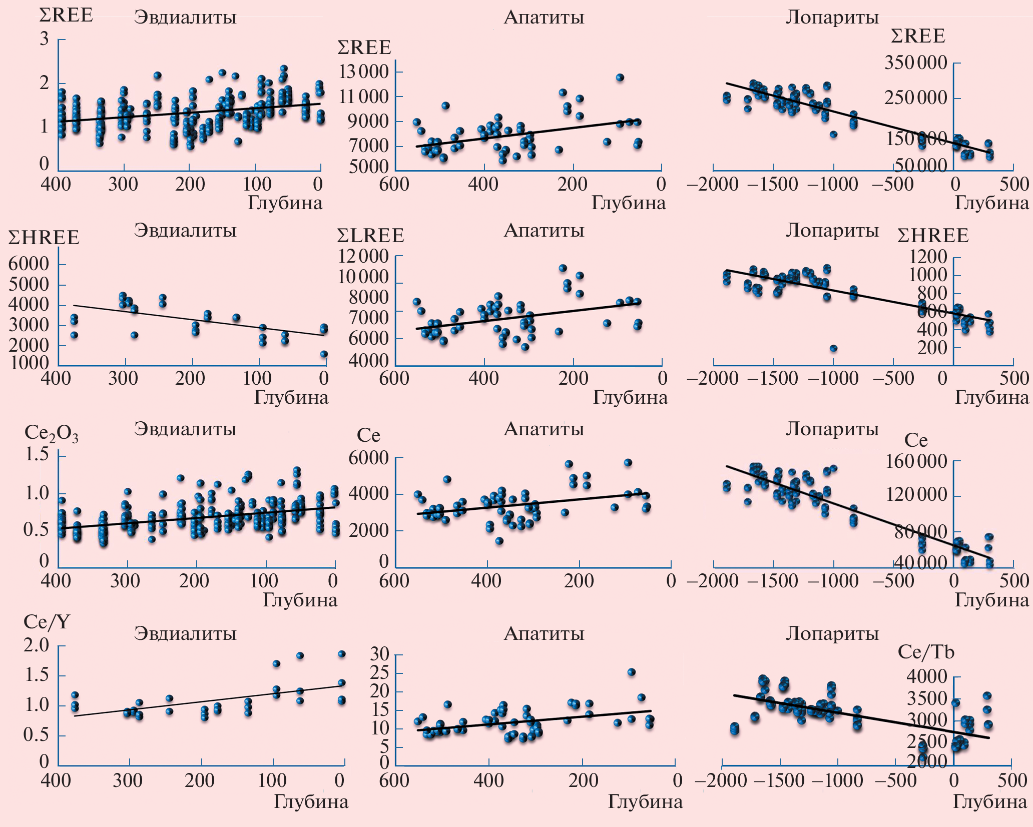 Work has been carried out to assess the rare-earth potential of the main ore minerals -loparite, eudialyte and apatite of the Lovozersky and Khibinsky deposits. Super-large deposits of loparite and eudialyte are associated with the giant Lovozero intrusion (Eastern Fennoscandia, Kola Peninsula). There are a number of apatite deposits in the Khibiny complex. All these ores occupy a leading place in the structure of the raw material of Russia. The highest contents of the sum of rare earth metals are characteristic of loparite ores (the content of ΣREE in loparites is about 28 wt%), and light rare earths sharply prevail over heavy ones, the Ce/Yb ratio is about 78 000. The amount of REE in eudialites is about 2 by mass%. A remarkable feature of eudialyte ores is the high concentrations of the heavy REE group, the Ce/Yb ratio is about 14. The apatites of the Khibiny deposits occupy an intermediate position: the Ce/Yb ratio is 680, and the average concentration of the REE sum is 0.9 wt%. The conditions of formation of apatite, loparite and eudialyte ores are considered.