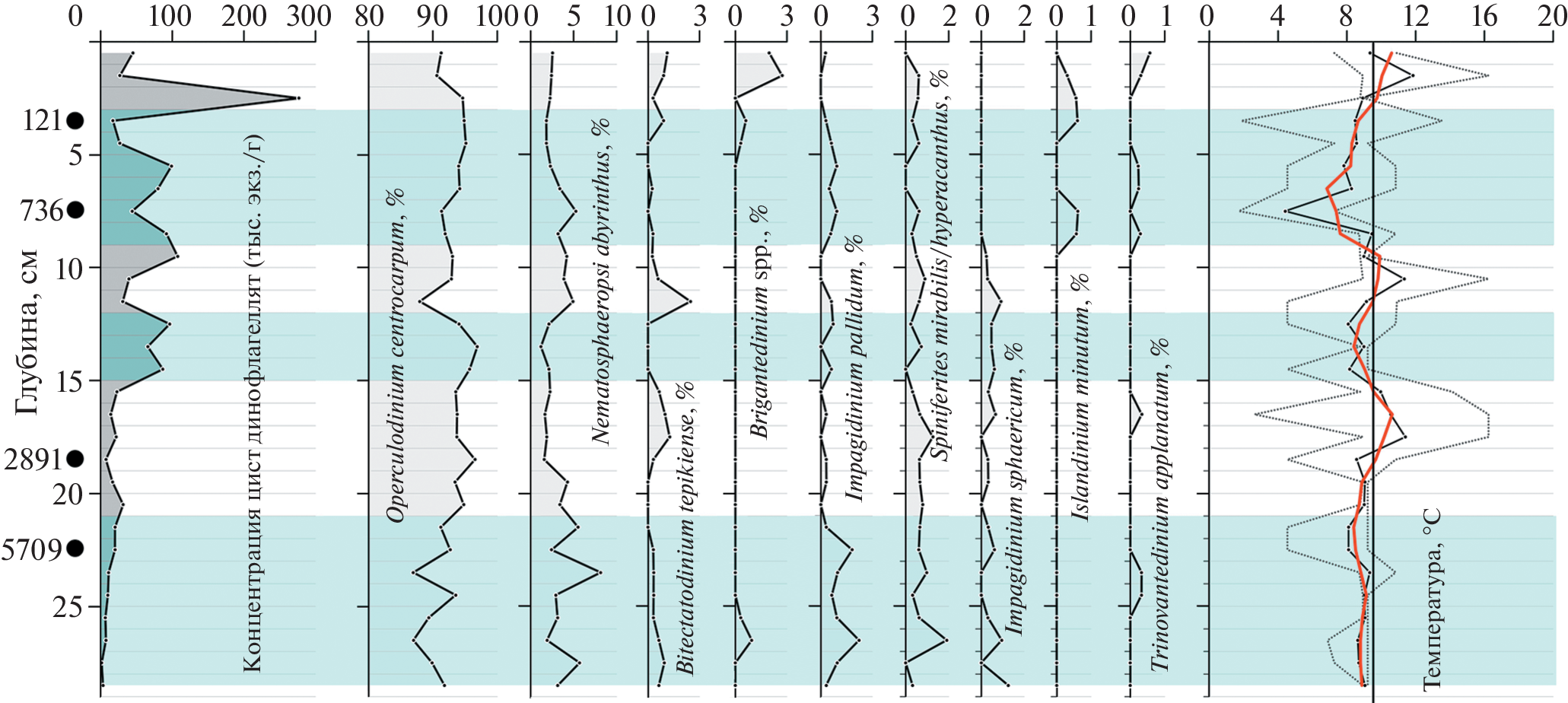 Detailed micropaleontological analysis was performed on the sediment core AMK-6142 collected in the deep-sea southwestern part of the Lofoten Basin in the Norwegian Sea. Summer sea-surface temperature for the last 7 cal. ky was reconstructed from dinocyst assemblages using the modern analogue technique (MAT). Sea-surface temperature reconstruction and dinocysts species composition indicate repeated changes in the surface environments during the Middle and Late Holocene. Episodes of cooling and probable displacement of the Arctic Front to the southwestern part of the Lofoten Basin were recorded for 5–7, 1.6–2.1, and 0.1–1.0 cal. ka BP.