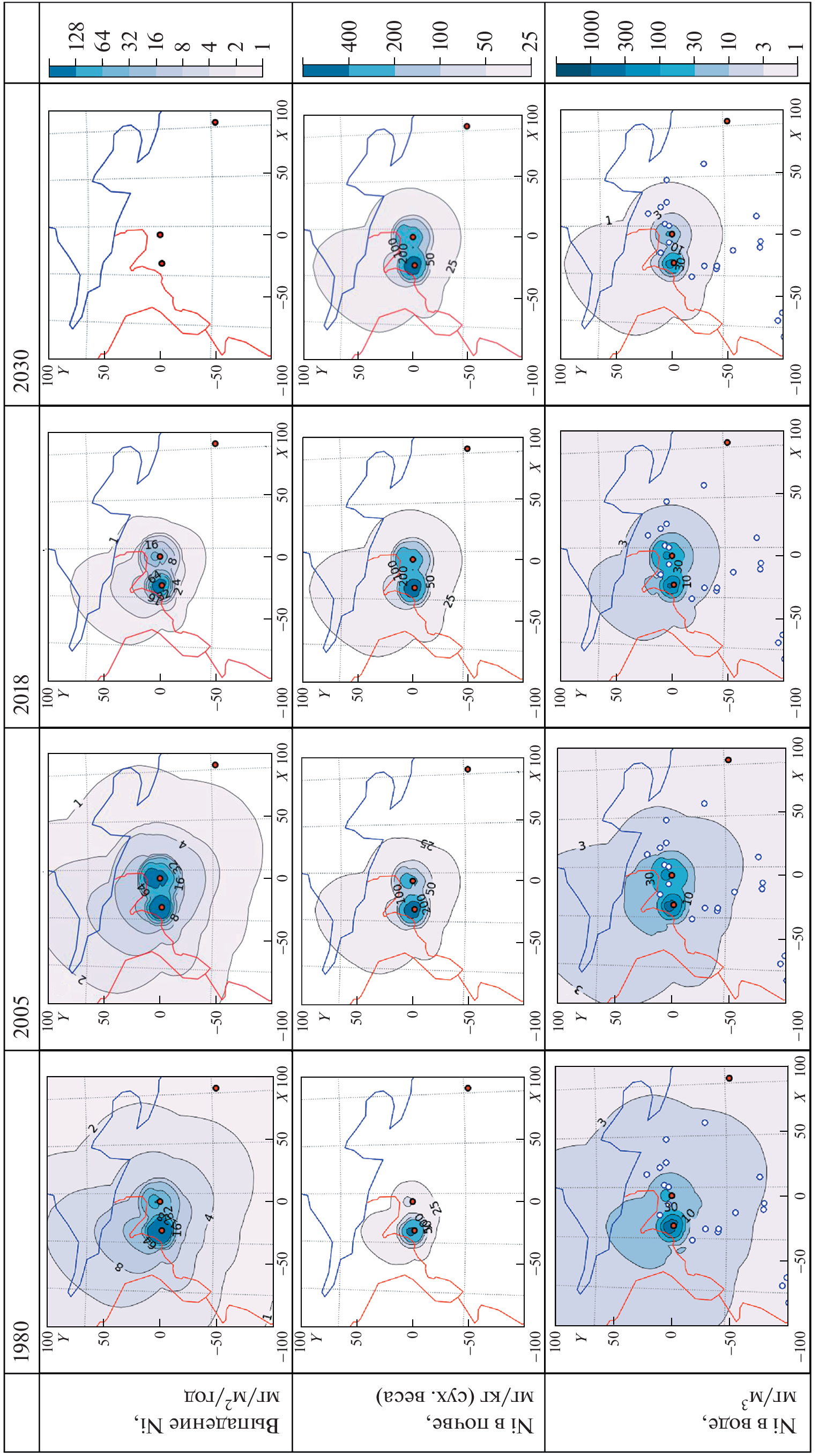 The article deals with modeling the dynamics of nickel concentration in soils, water and bottom sediments of lakes, caused by emissions into the atmosphere of the Pechenganickel plant (Kola Peninsula) during the entire period of its operation. The technology of balanced identification is used, which allows, based on a mathematical description of heterogeneous geochemical processes occurring in ecosystems, to combine heterogeneous experimental data and build a computer model with an optimal balance of complexity and closeness to data. The results are presented and discussed, including estimates of the retrospective state of the simulated objects (before the start of intensive studies) and a forecast of their dynamics until 2030. According to model calculations, the intensity of Ni accumulation in soil was 2.4 and 2 times higher in bottom sediments during maximum precipitation periods (1980–2005), while according to the model forecast, after the shutdown of the plant, Ni accumulation in bottom sediments will begin to decrease and Ni will slowly leach from the soil with an intensity of 0.2 mg/m2 year.