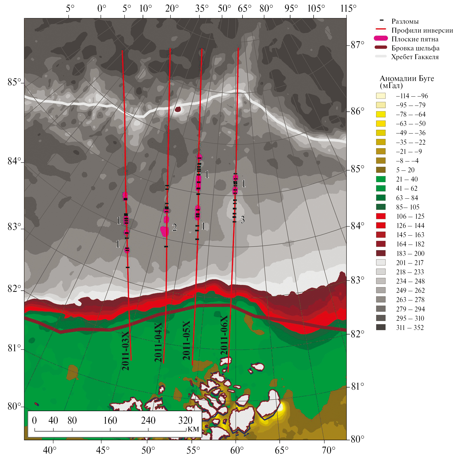 Рис. 3. Пространственное распределение выявленных по сейсмическим данным разломов и аномалии “плоское пятно” по данным [7]. Аномалии Буге рассчитаны по данным Arctic Gravity Project [12] на сетке грида 2500 м с использованием рельефа IBCAO v.3 [14]. Красными линиями показаны профили, вдоль которых была рассчитана инверсия гравитационного поля (рис. 4). Профили проведены вдоль положения сейсмических разрезов (рис. 1) с продолжением на шельф и к пересечению с хребтом Гаккеля. Цифрами обозначены пространственные комбинации наблюдаемых на разрезах аномалий и разломов: 1 – разломы в сочетании с плоскими пятнами; 2 – плоские пятна без разломов; 3 – разломы без плоских пятен.
