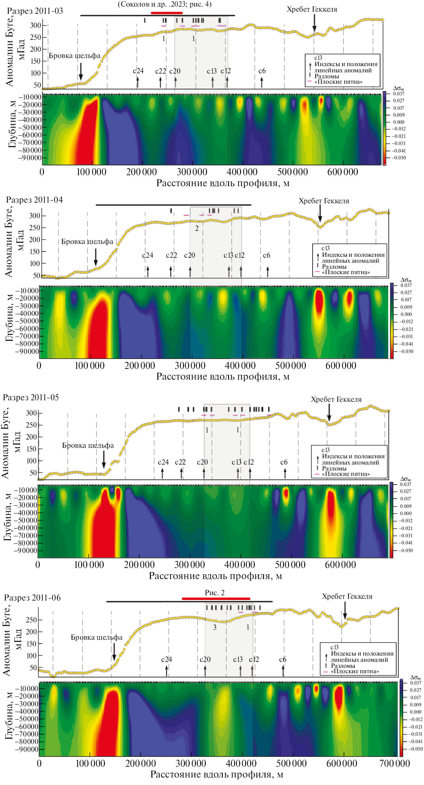Рис. 4. Расчет инверсии гравитационного поля вдоль сейсмических разрезов Арктика‑2011 3, 4, 5, 6 (рис. 1) по пролонгированным профилям, положение которых указано на рис. 3. Расчет выполнен в ПО ZondGM2D [5]. На разрезах вариаций плотностей показаны пересечения с линейными магнитными аномалиями по данным [16], разломы и плоские пятна. Красными линиями показаны положения фрагмента разреза на рис. 2 и [7, рис. 4]. Цифрами 1, 2 и 3 обозначены комбинации аномалий и разломов по карте рис. 3. Серыми прямоугольниками показаны области между ЛМА С20 и С12.