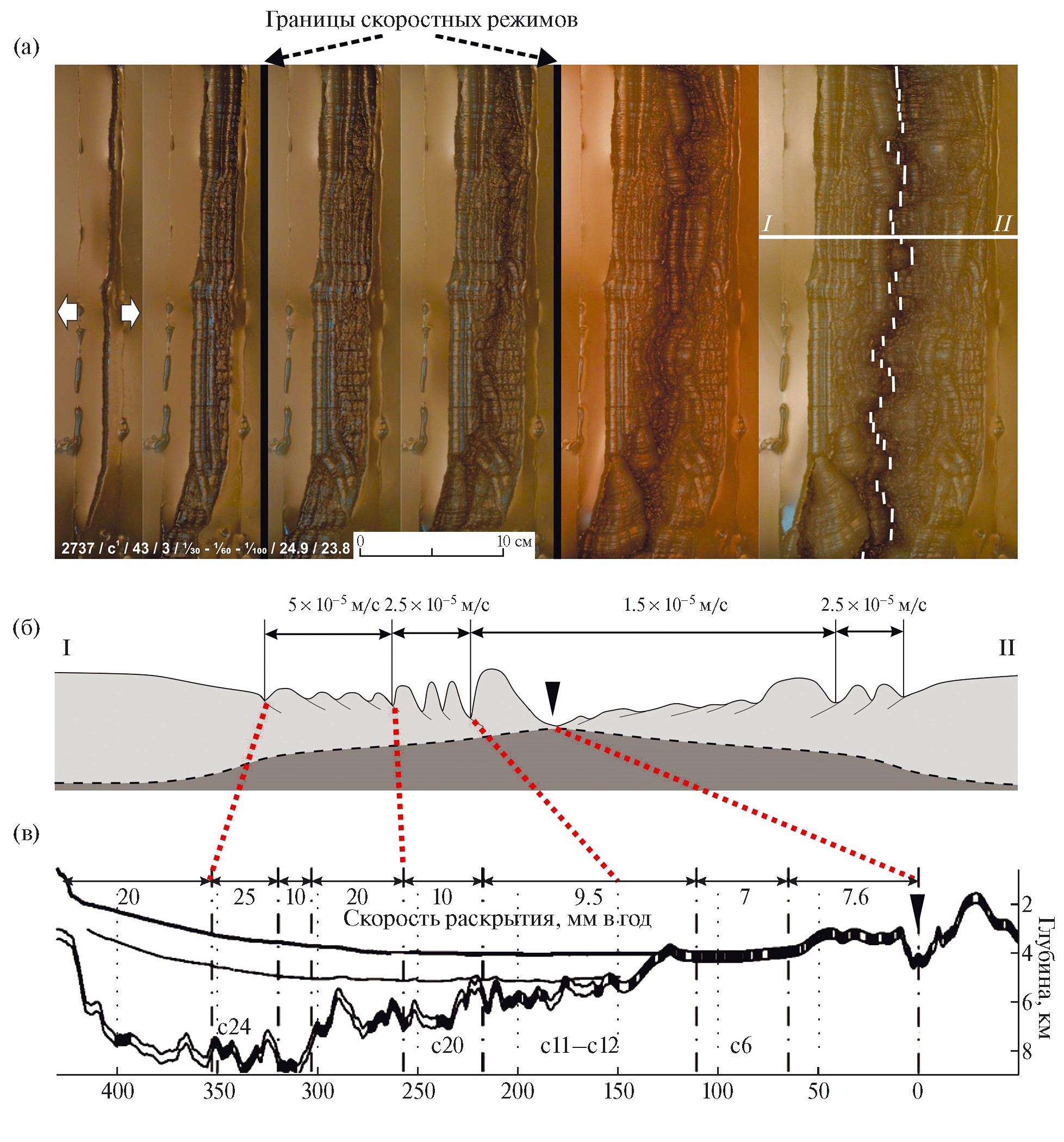 Рис. 5. Особенности структурообразования на южном фланге хребта Гаккеля при двухэтапном замедлении скорости спрединга по данным физического моделирования (эксперимент № 2737). а – поэтапные фотографии структур моделируемого рифта при направлении растяжения, ортогональном первичной ослабленной зоне; б – схематический разрез сформированного рельефа вдоль линии I‒II с указанием скоростей в физической модели; в – сопоставление разреза рельефа с результатами идентификации магнитных аномалий для профиля Арктика‑2011-3, рельефом фундамента и определением скоростей спрединга по данным [4].