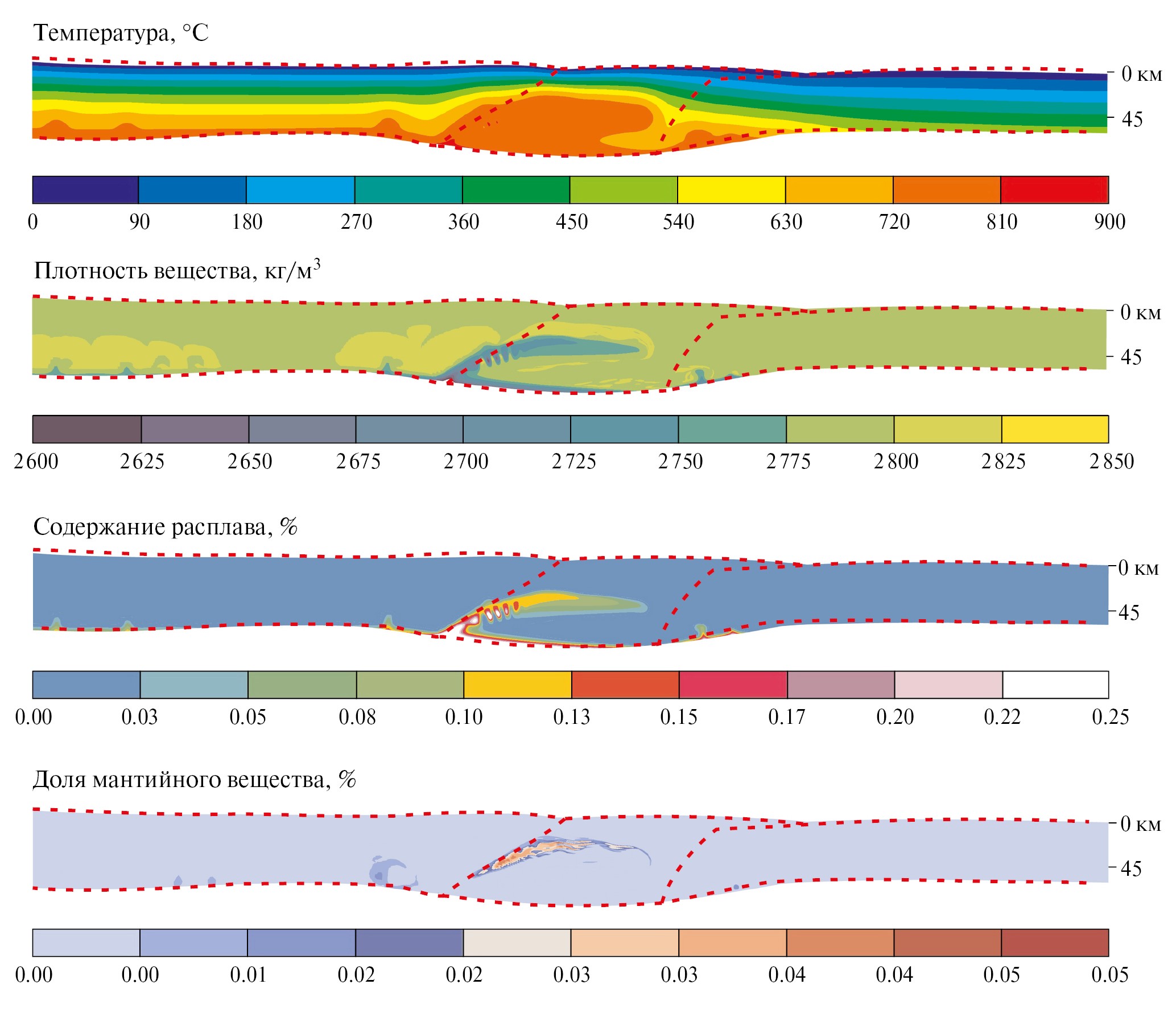 Рис. 2. Результаты расчета на момент времени действия повышенного теплового потока через 1.2 млн лет (возраст ~264 млн лет), показывающие распределение температуры, плотности вещества (2600 соответствует 25% расплава, 2800 – плотность твердой коры), доли расплава в магме, доли мантийной компоненты.