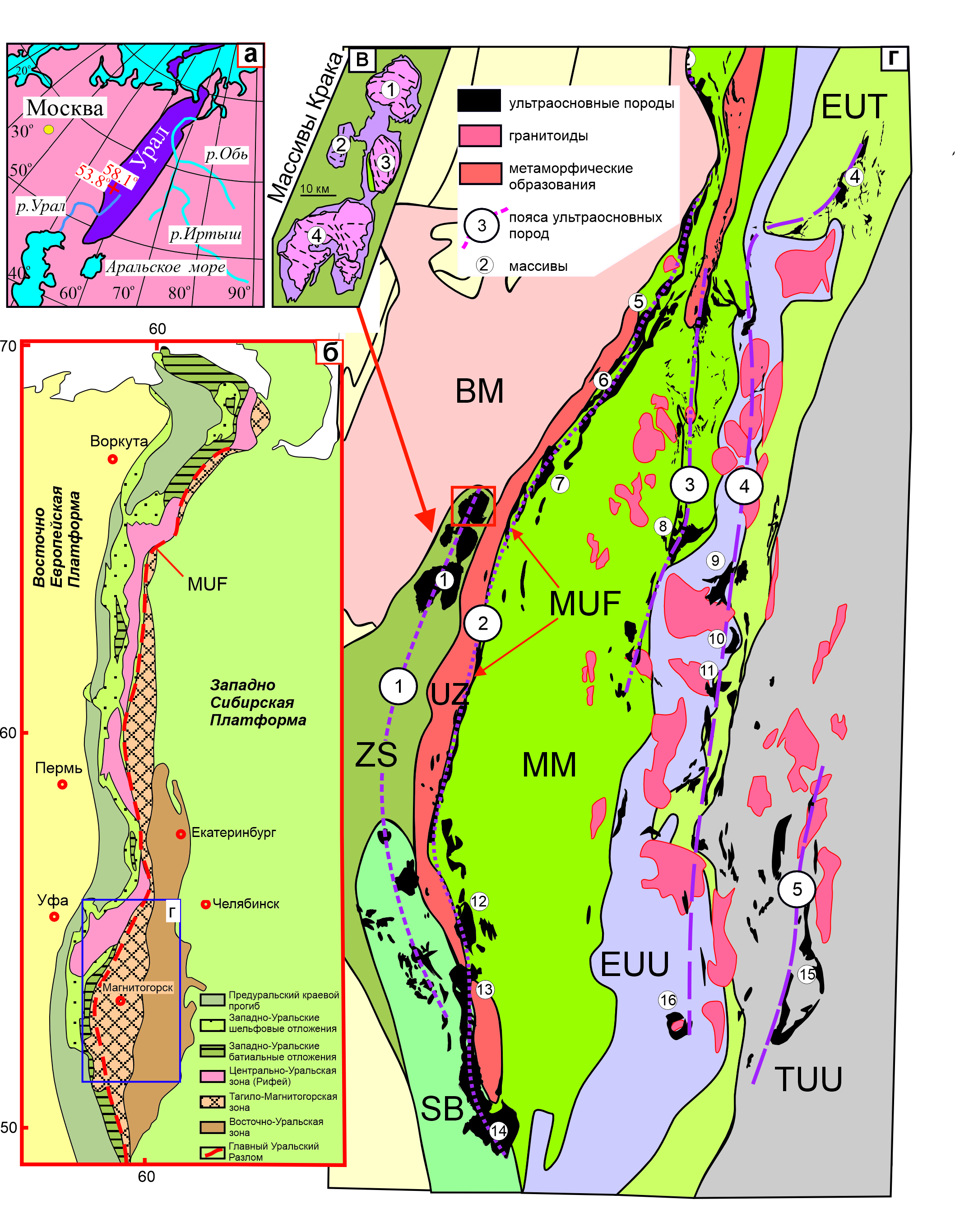 Рис. 1. а – локализация Уральского складчатого пояса; б – схема структурно-тектонического зонирования Урала [13] с дополнениями; в – массивы Крака: 1 – Северный; 2 – Узянский; 3 – Средний; 4 – Южный; г – распространение ультраосновных пород на Южном Урале. Пояса ультраосновных пород: 1 – Западный (Крака–Медногорский); 2 – Зона Главного Уральского разлома; 3 – Миасс-Куликовский; 4 – Казбаево; 5 – Восточный. Массивы ультраосновных пород [13, 17]: 1 – Крака (вкладка “в”); 2 – Уфалей; 3 – Таловский; 4 – Муслюмово; 5 – Нурали; 6 – Калкан; 7 – Миндяк; 8 – Куликовский; 9 – Татищево; 10 – Верблюжьегорский; 11 – Варшавка; 12 – Халилово; 13 – Хабарный; 14 – Кемпирсай; 15 – Аккарга; 16 – Киембай. Цвета выделяют различные структурные зоны: BM – Башкирский мегантиклинорий; EUT – Восточно-Уральский прогиб; EUU – Восточно-Уральское поднятие; MM–Магнитогорская мегазона; MUF – Главный Уральский разлом; SB – Сакмарская котловина; TUU –Зауральское поднятие; ZS – Зилаирский синклинорий.