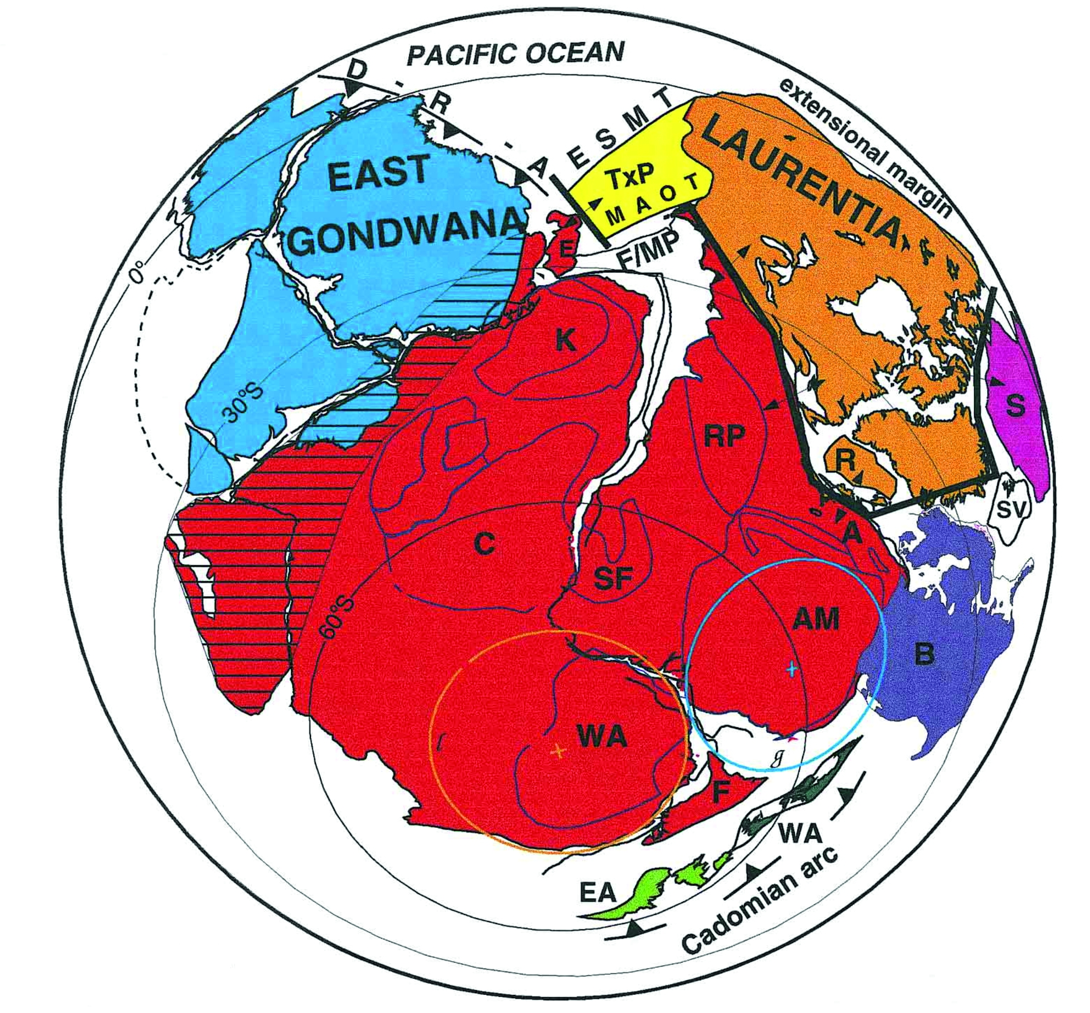 Рис. 7. Геологически обусловленная реконструкция суперконтинента Паннотия, который, вероятно, существовал вблизи докембрийско-кембрийской границы, 600–540 млн лет [8]. Панафриканско-бразильские (паннотские; [18]) бассейны показаны закрытыми, хотя некоторые из них, возможно, сохранились до кембрия ([11]). Примечательно, что авторы [20] интерпретировали палеомагнитные данные как требующие разделения Лаврентии и Гондваны более чем на 5000 км на границе докембрия и кембрия. Трактовка основана в первую очередь на геологических аргументах, поскольку показанные палеомагнитные полюса не подтверждают такое близкое соседство Лаврентии и Гондваны [8]. Pacific ocean – Тихий океан; Extensional margin – расширение восточной окраины Тихого океана; East Gondwana – восточная часть суперконтинента Гондвана; Laurentia – суперконтинент Лаврентия; Cadomian arc – кадомская магматическая дуга; A – Arequipa massif; AM –Amazonian craton; B – Baltica (Russian craton); C– Congo craton; D-R-A – Delamerian-Ross arc; E – Ellsworth-Whitmore mountains block (in Pangea position); EA – East Avalonia (southern British Isles); ESMT – hypothetical Ellsworth-Sonora- Mojave transform; F/MP – Falkland-Malvinas Plateau; K – Kalahari craton; MAOT – hypothetical Malvinas-Alabama- Oklahoma transform; R – Rockall Plateau with adjacent northwest Scotland and northwest Ireland; RP – Rio de la Plata craton; S – Siberia (Angara craton); SF – São Francisco craton; SV – Svalbard block (Barentia); WA – West African craton; TxP – hypothetical Texas plateau. Линии с черными треугольниками – верхние плиты зон субдукции (кадомский ярус) и зарождающихся зон субдукции (дуга Деламерия – Росса, D-R-A); жирные линии – зарождающиеся mid-Iapetus хребты; диагональные линии – коллизионный ороген восточной Африки, включающий восточную и западную Гондвану.