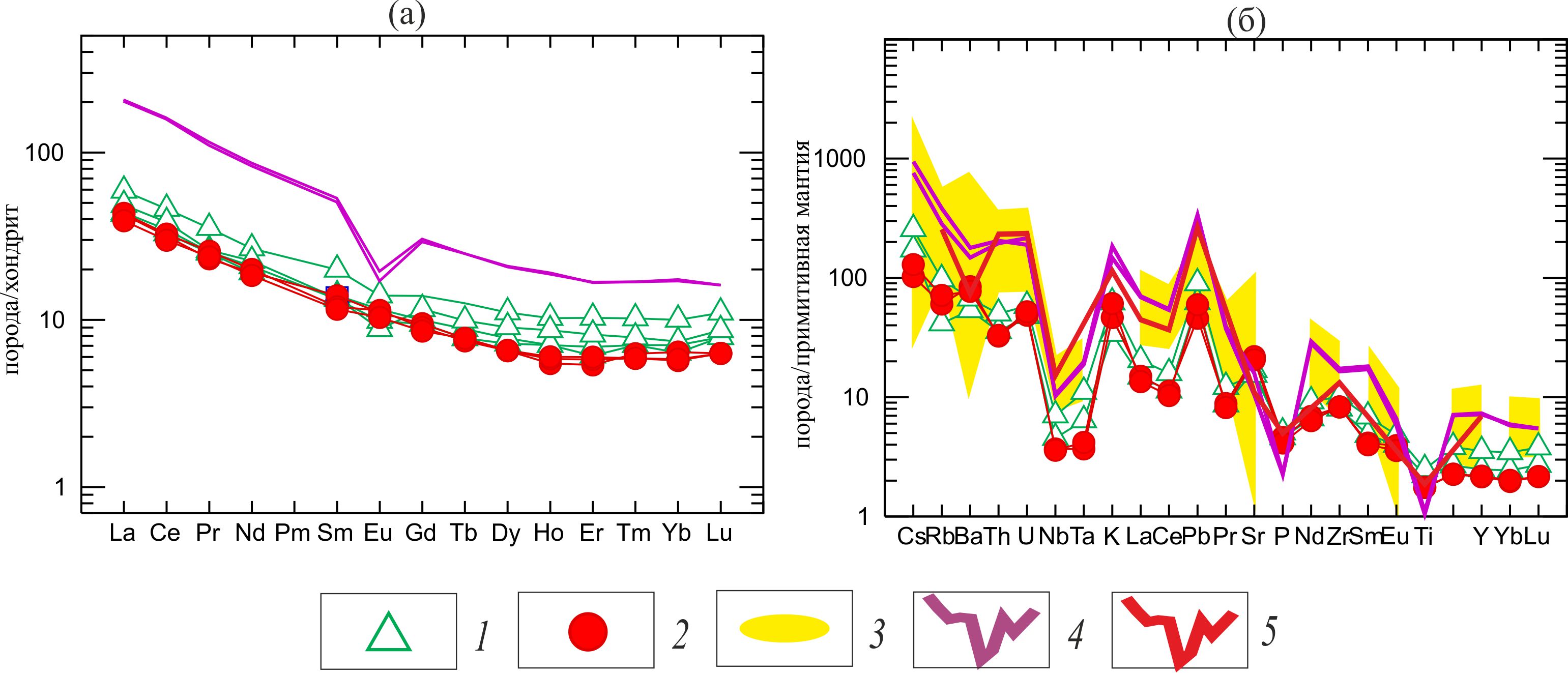 Спайдерграммы примесных элементов, нормированных на состав примитивной мантии для гранитоидов р. Северной и оз. Майниц, характеризуются обогащением крупноионными литофильными элементами относительно высокозарядных и минимумами Nb, Тa, P, Ti (рис. 4 б). Спайдерграммы сходны с таковыми для меловых вулканитов кислого состава Охотско-Чукотского вулканического пояса (ОЧВП), в том числе альбского возраста, и среднего состава гранитов I-типа (рис. 4 б).