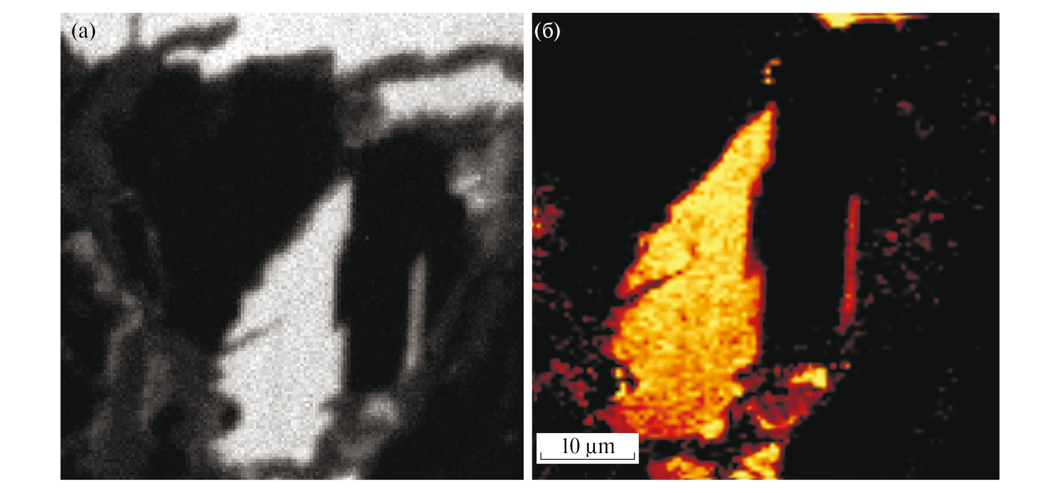 Рис. 4. Оливин в срастании с гидроксилклиногумитом: а) – карта в лучах титана (светлое – клиногумит, черное – оливин); б) – карта линий клиногумита 742+783 см‑1 на рамановском спектре (желтое – клиногумит).