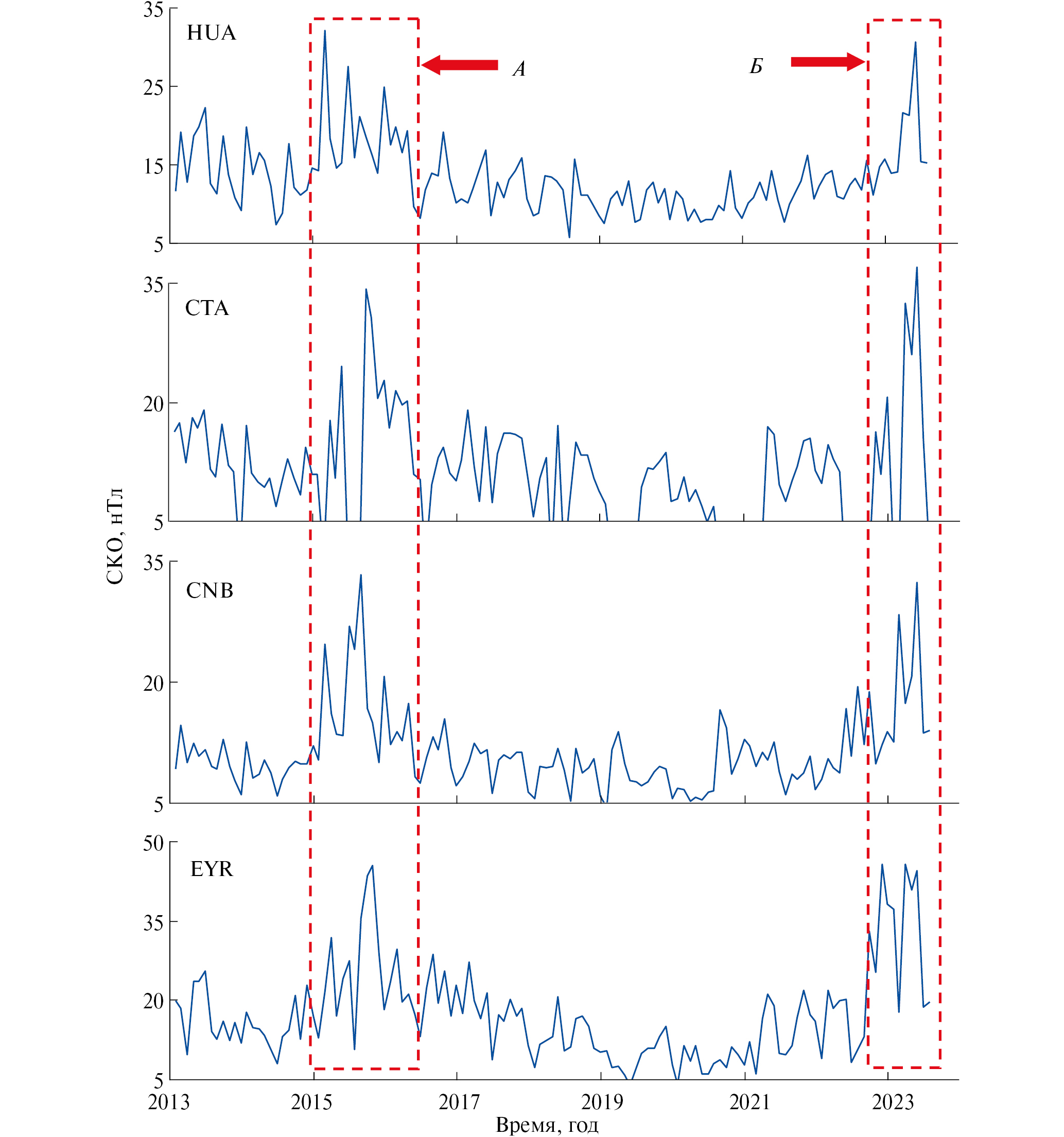 Рис. 2. Вариации компонент магнитного поля в период Эль-Ниньо 2015 г. (А) и в период подготовки Эль-Ниньо 2023–2024 г. (Б).