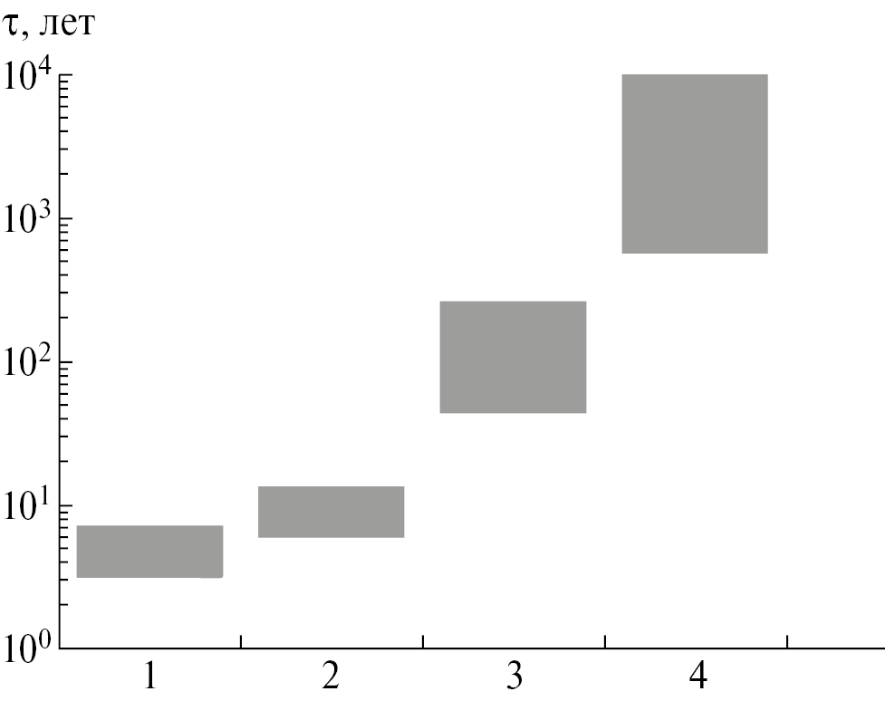В геохимических задачах часто для оценки временного масштаба отклика используется соотношение между запасом C вещества в данном резервуаре системы и интенсивностью F выводящего потока из этого резервуара [8–12]: