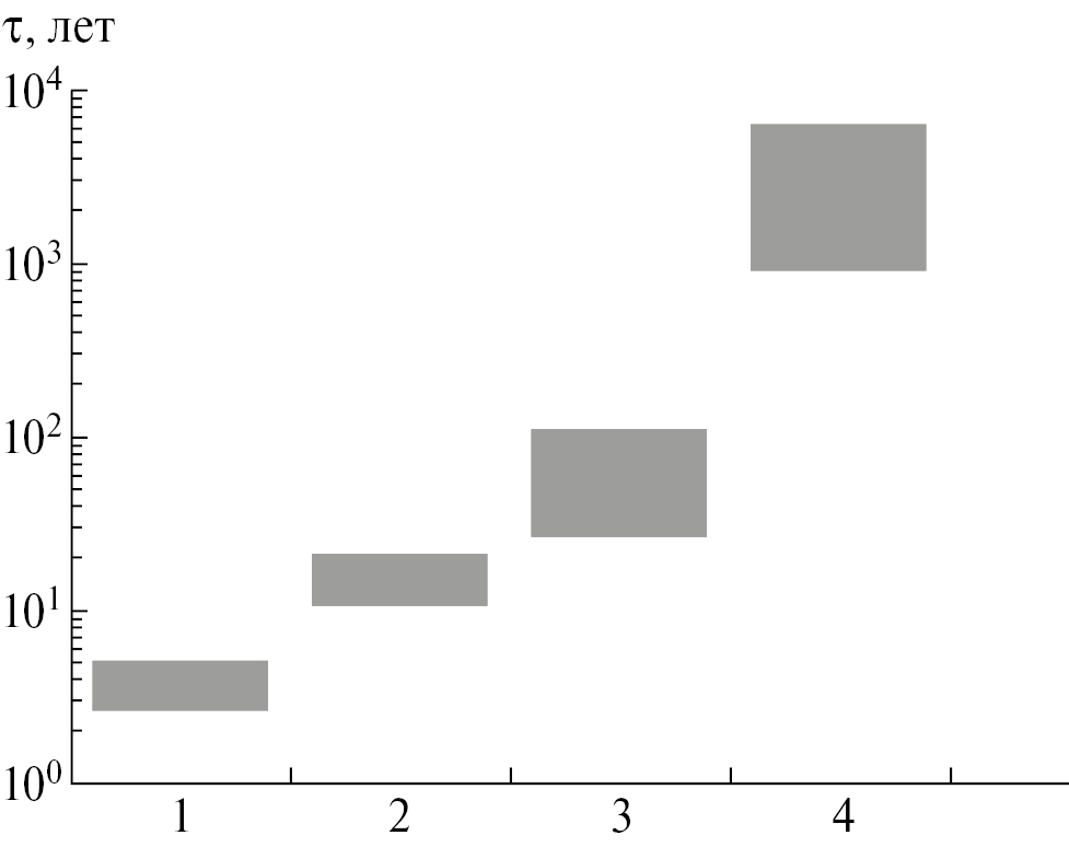 Рис. 1. Интервалы изменения временных масштабов отклика на внешнее воздействие для варианта 3 модели (в зависимости от значений ее параметров). По оси абсцисс указан номер собственного числа линеаризованного оператора эволюции для рассматриваемой модели.