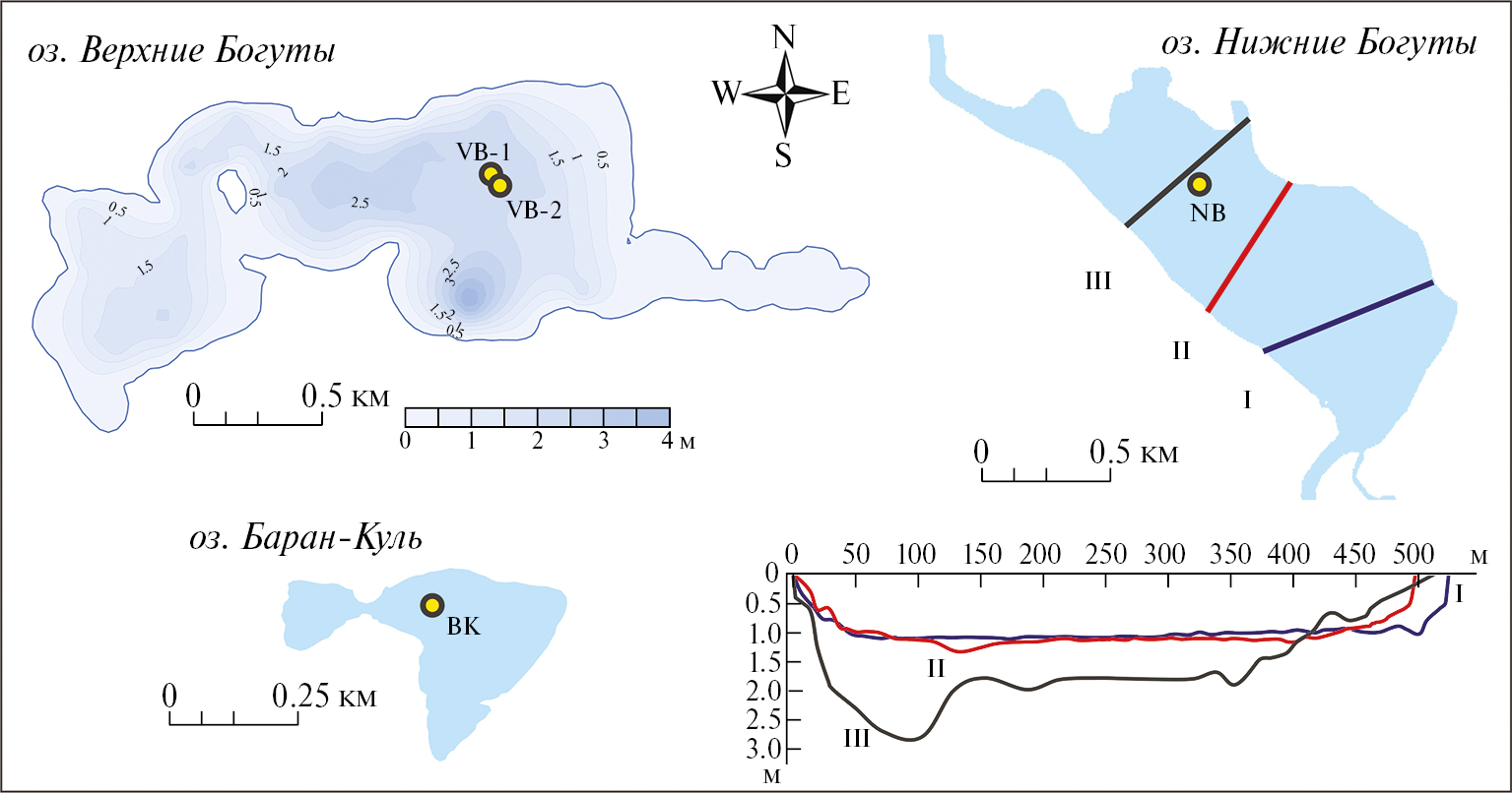 Для решения этих и многих других вопросов было проведено бурение донных отложений трех озер Богутинской впадины: двух крупнейших моренно-подпрудных, Нижних и Верхних Богутов, сформировавшихся в пределах соответственно нижнего и верхнего комплексов конечно-боковых морен, и наиболее крупного из термокарстовых, названного нами Баран-Кулем, расположенного в пределах верхнего моренного комплекса (рис. 1). Эти озера выбраны как потенциально наиболее долгоживущие и хранящие наиболее полную летопись природных событий и при этом относящиеся к разным лимно-гляциальным комплексам впадины.