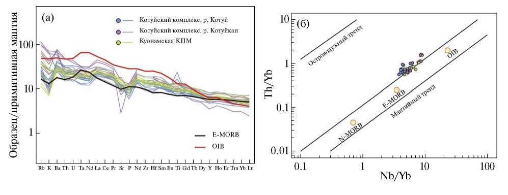 Рис. 3. Геохимические характеристики пород котуйского комплекса р. Котуй, р. Котуйкан (по данным [4]) и Куонамской КМП [8]. а) Мультиэлементная диаграмма с концентрациями элементов, нормализованными к примитивной мантии [16]; б) диаграмма Th/Yb–Nb/Yb [17].
