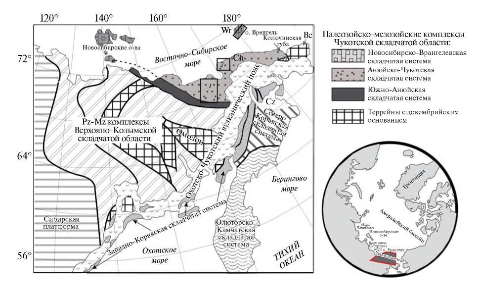 Рис. 1. Схема тектонического районирования Чукотской складчатой области, по ([14], с добавлениями). Прямоугольниками отмечены районы работ: 1 – Западная Чукотка, Анюйский субтеррейн; 2 – м. Кибера и окрестности Певека, Чаунский субтеррейн; 3 – о. Врангель, Врангелевский террейн. На врезке – положение района работ (многоугольник) на карте Арктики.