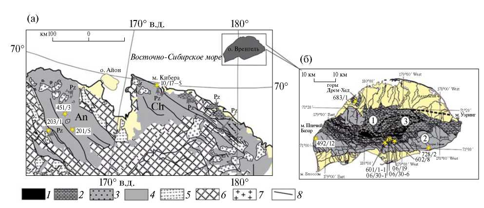 Рис. 2. Положение проанализированных образцов на геологических картах Чукотки (а) и о. Врангеля (б); (а) Геологическая карта Чукотки – фрагмент геологической карты обрамления Восточно-Сибирского и Чукотского морей, использована ([24], с упрощением); An ‒ Анюйский субтеррейн, Ch – Чаунский субтеррейн. Звездочками обозначено положение проанализированных образцов, их номера обозначены цифрами. Геологическая карта о. Врангель, по материалам [8] (с упрощением). На карте о. Врангеля цифры в кружках означают тектонические зоны: 1 – северную, 2 – южную, 3 – центральную, по материалам [14]. Условные обозначения: Породные и осадочные комплексы: 1 – неопротерозойские; 2 – палеозойские; 3 – пермо-триасовые; 4 – триасовые; 5 – юрские; 6 – меловые; 7 – граниты меловые; 8 – разломы.