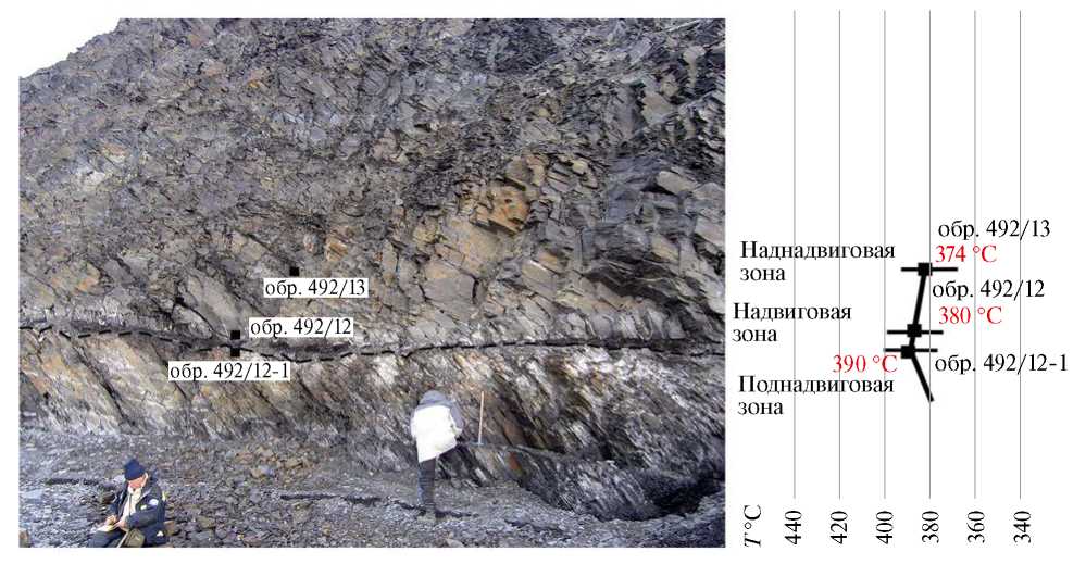 Рис. 3. Фотография надвига в триасовых породах на западе о. Врангеля, м. Птичий Базар, с точками отбора образцов. Граница надвига показана прерывистой линией. Справа от фотографии представлены номера образцов, в которых установлена температура формирования новообразованных минералов, горизонтальные толстые линии – пределы определенных значений.