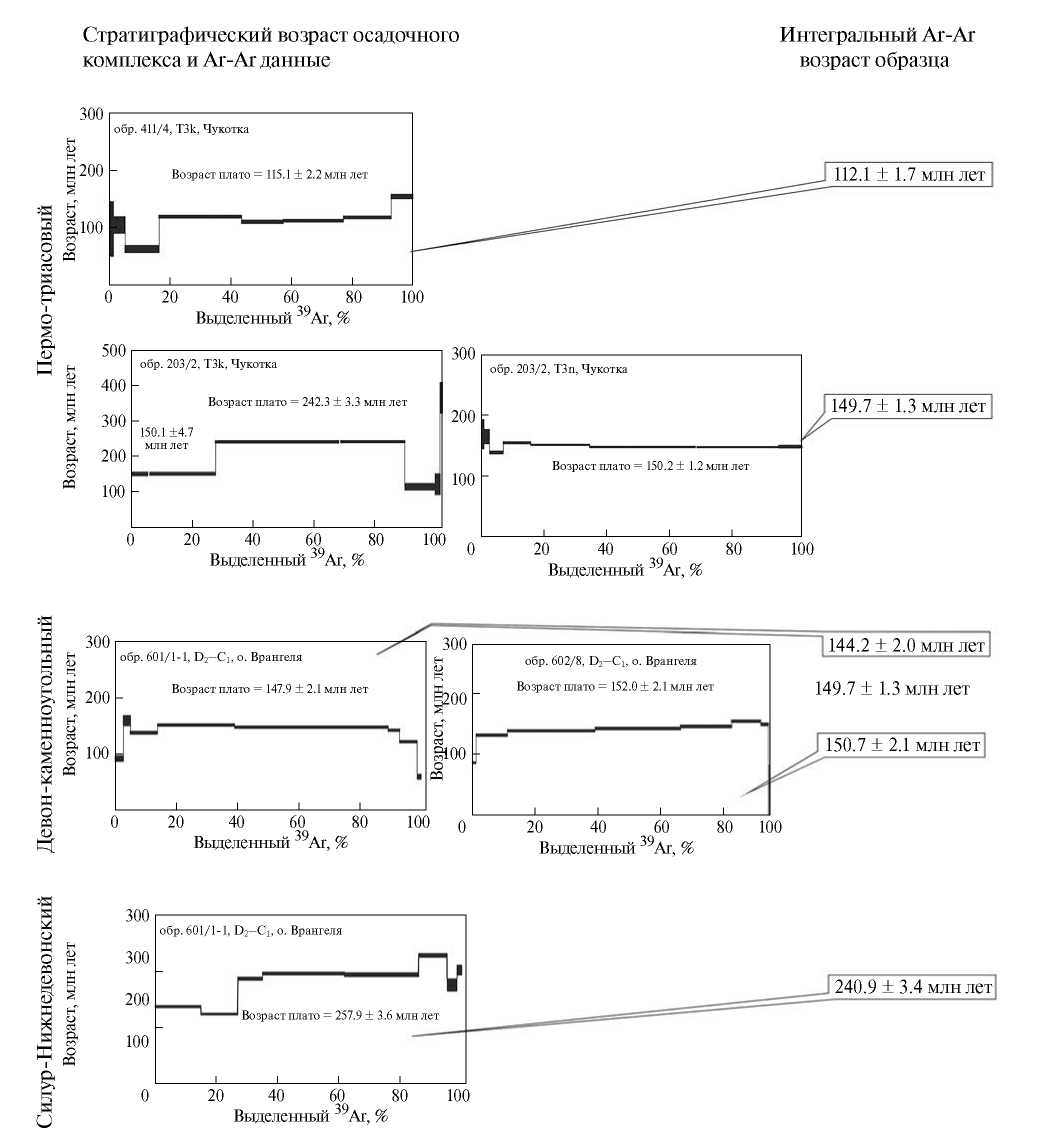 Рис. 4. Результаты40Ar/39Ar-датирования в терригенных триасовых и палеозойских отложениях Чукотки и о. Врангеля.