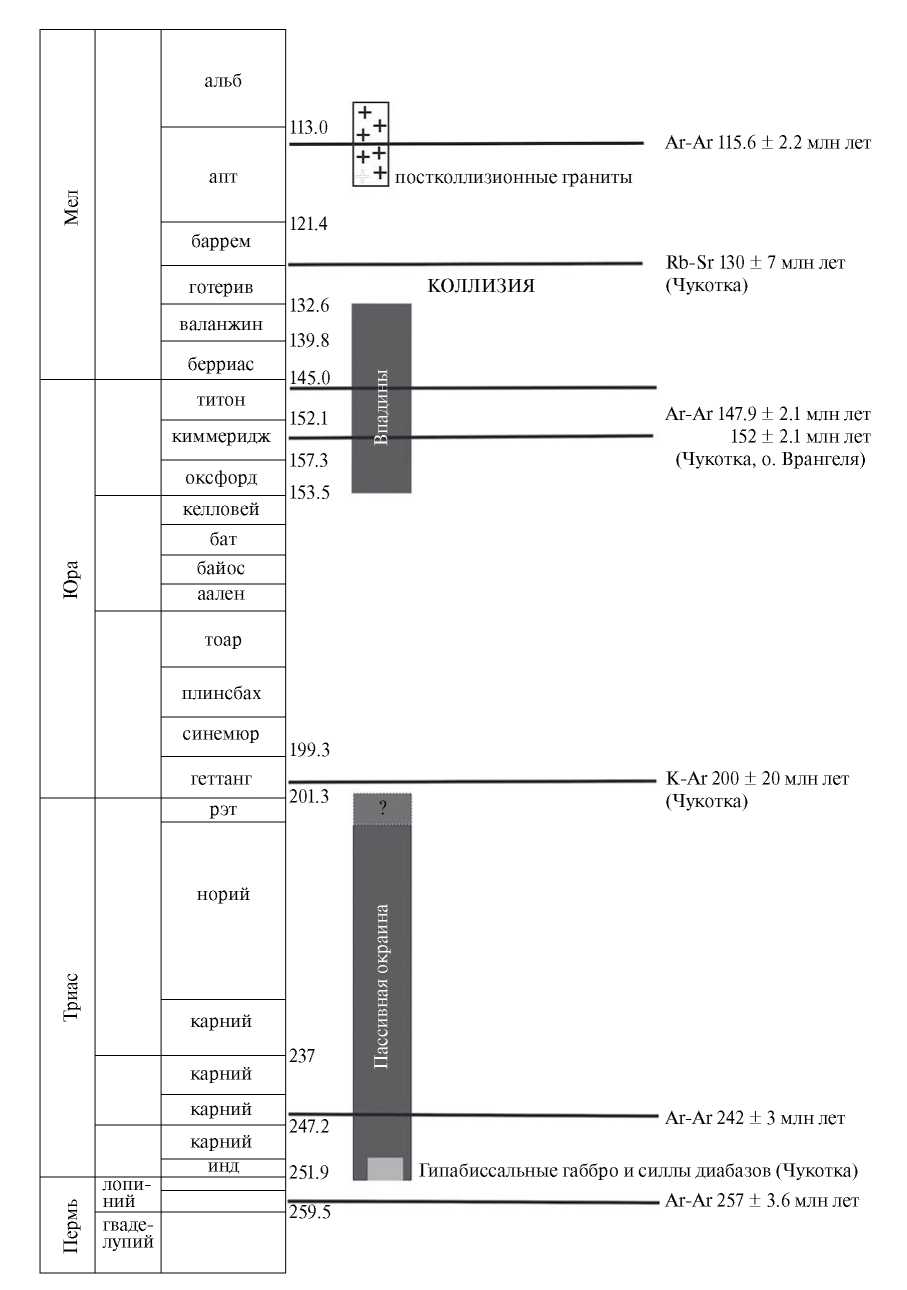 Рис. 5. Основные деформационные события на территории Чукотки и о. Врангеля по результатам изотопного (40Ar/39Ar-, K/Ar-, Rb/Sr-) датирования показаны в соответствии с этапами развития осадочных бассейнов.