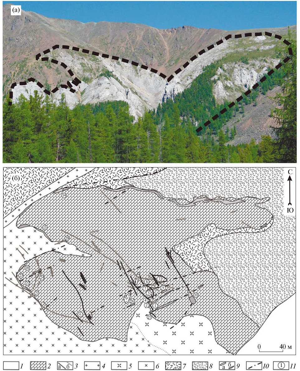 Рис. 2. Строение Илейского рудопроявления. а – фотография, пунктиром выделены выходы известняков монгошинской свиты; б – геологический план Илейского рудопроявления. 1 – ледниковые отложения; 2 – известняки верхнепротерозойской Монгошинской свиты; 3–8 – девонский вулкано-плутонический комплекс: 3–6 – Огнитский комплекс: 3 – дайки: а – гранит-порфиры, кварцевые порфиры, б – измененные порфириты, 4 – мелкозернистые лейкократовые граниты, 5 – средне- и крупнозернистые порфировидные лейкократовые граносиениты и кварцевые сиениты, 6 – лейкократовые сиенит-порфиры; 7–8 – Илейская толща: 7 – фельзиты, 8 – лавобрекчии; 9 – флюоритовые жилы: а – закартированные, б – предполагаемые; 10 – разломы; 11 – номера рудных тел.
