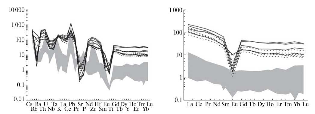 Рис. 4. Графики нормированного распределения редких и редкометалльных элементов в магматических породах и рудах Илейского рудопроявления по [11]. Гранитоиды – сплошные линии; вулканиты илейской толщи – пунктирные линии; руды – выделены серым полем.