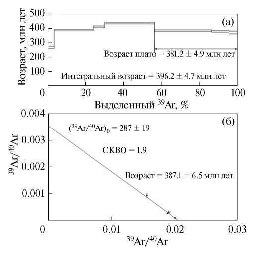 Рис. 5. Rb‒Sr-изохронная диаграмма для вулканитов илейской толщи. Ar‒Ar-геохронологические исследования были выполнены по арфведсониту, выделенному из субщелочных гранитов. Исследование было выполнено в ИГиМ СО РАН по методике, описанной в работе [17]. Плато, построенное по трем ступеням с 43.8% выделенного39Ar, характеризуется значением возраста 381±5 млн лет (табл. 3, рис. 6). На изохронной диаграмме для линейной регрессии по 4 точкам рассчитано значение возраста – 387±6 млн лет, согласующееся с возрастом плато (рис. 6 б). Таким образом, можно считать значение 387±6 млн лет соответствующим времени закрытия изотопной системы амфибола и времени становления субщелочных гранитов.