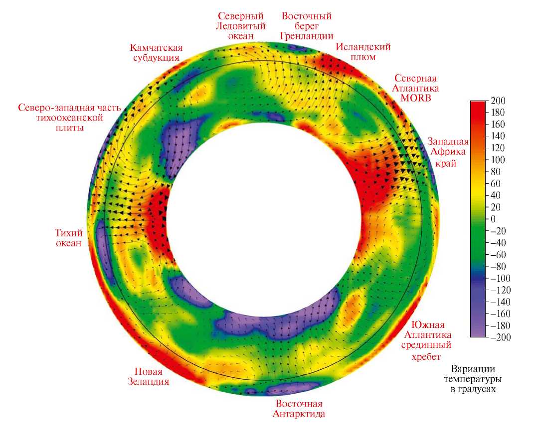 На рис. 2 показаны вариации температуры в мантии в сферическом меридиональном сечении Земли через полюса через 20 и 200 градусов восточной долготы. Глобальные горячие восходящие потоки поднимаются из нижней мантии Земли под Тихим океаном и под Африкой. Нисходящий поток между Африкой и Евразией формирует зоны субдукции в Средиземном море. Более слабый и частично верхнемантийный поток поднимается к поверхности в Арктике. Южнее Аляски нисходящий поток приурочен к Алеутской зоне субдукции. Под Восточной Антарктидой имеет место нисходящий мантийный поток.