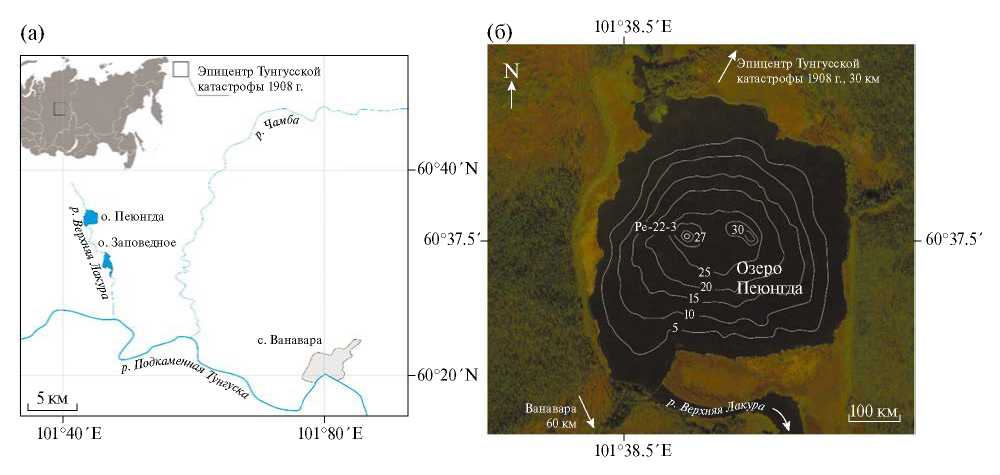 Озеро Пеюнгда (60°37ʹ30ʺ с. ш., 101°38ʹ47ʺ в. д.; 259 м н. у.м) находится на границе Государственного природного заповедника “Тунгусский” (Эвенкийский район Красноярского края), в 60 км от поселка Ванавара, и приблизительно в 30 км к юго-западу от предполагаемого эпицентра взрыва Тунгусского космического тела (ТКТ) 1908 г. Через озеро протекает небольшая река Верхняя Лакура, приток реки Подкаменная Тунгуска. Озеро пресноводное, округлой формы диаметром более 800 м и максимальной глубиной 30 м [12]. Площадь составляет около 0.6 км2 (рис. 1).